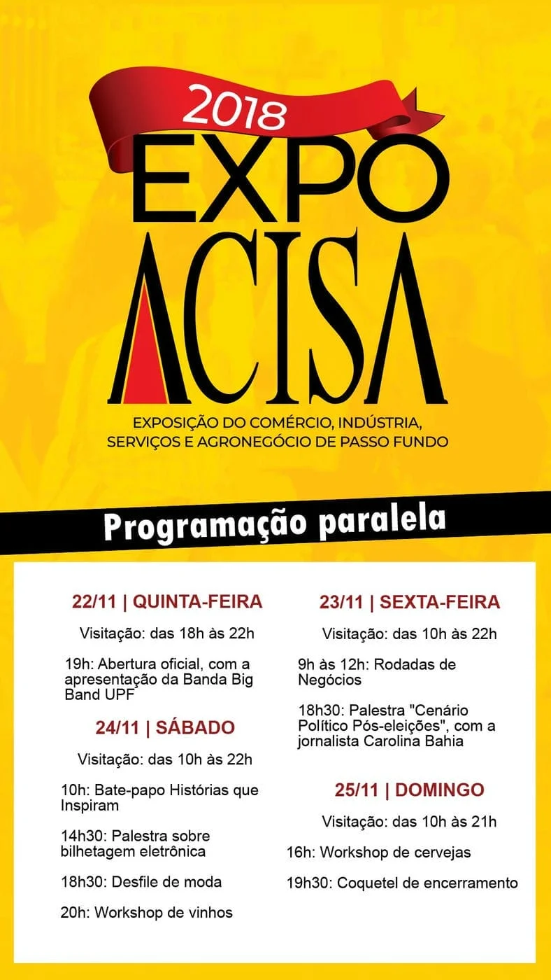 Você pode visitar a Expoacisa até o próximo domingo, 25 de novembro, no Bourbon Shopping, das 10h às 22h. Confira abaixo a programação paralela do evento.
