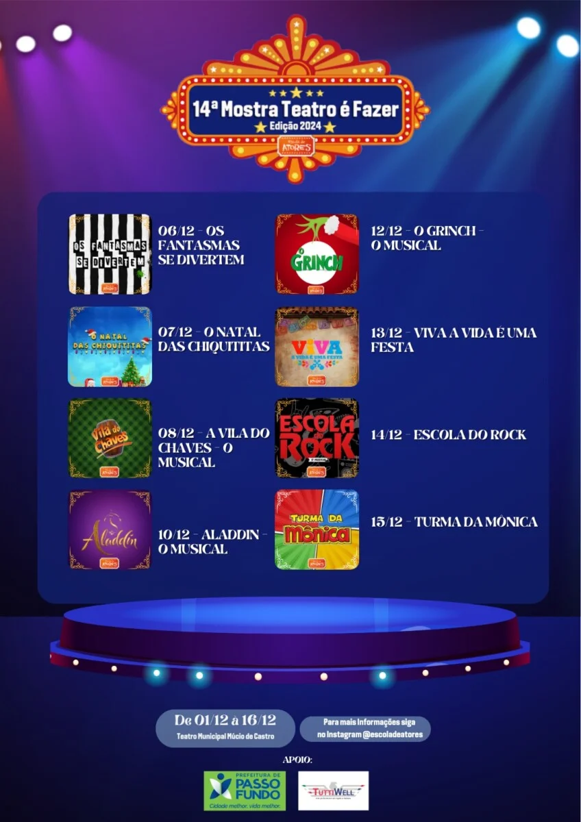 Com mais de 200 atores envolvidos e uma estimativa de público de 3 mil pessoas, o evento, que há mais de uma década transforma a cena cultural da região, acontece de 01 à 16 de dezembro no Teatro Municipal Múcio de Castro. A programação deste ano incluiu o 1º Festival de Cinema da Escola Mario Quintana no dia de abertura, marcando o início de 16 dias programação cultural.