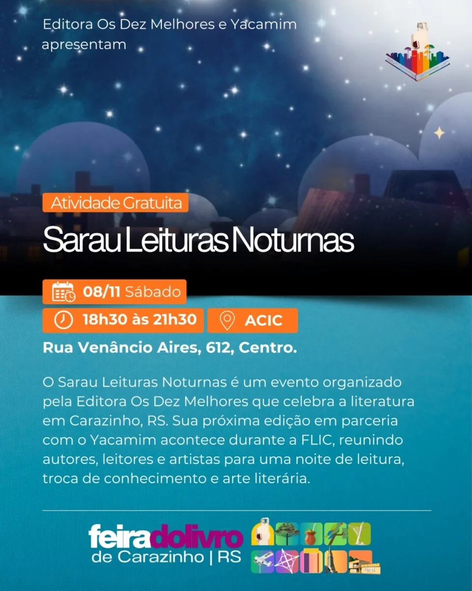 Nesta edição, o Sarau Leituras Noturnas integra a programação da FLIC, a Feira do Livro de Carazinho, e acontece em parceria com o Instituto Yacamim, entidade que, há 18 anos, transforma realidades e reconstrói futuros por meio da educação, da cultura e do afeto, atendendo crianças e adolescentes em situação de vulnerabilidade social no município.