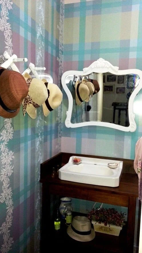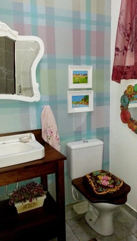 Aqui um exemplo de estampa que criei para minha cozinha e que posteriormente foi adaptada na Biostore. No lavabo, desenvolvi uma estampa em xadrez com floral. Todos confeccionados e instalados pela M Idéias Comunicação Visual.