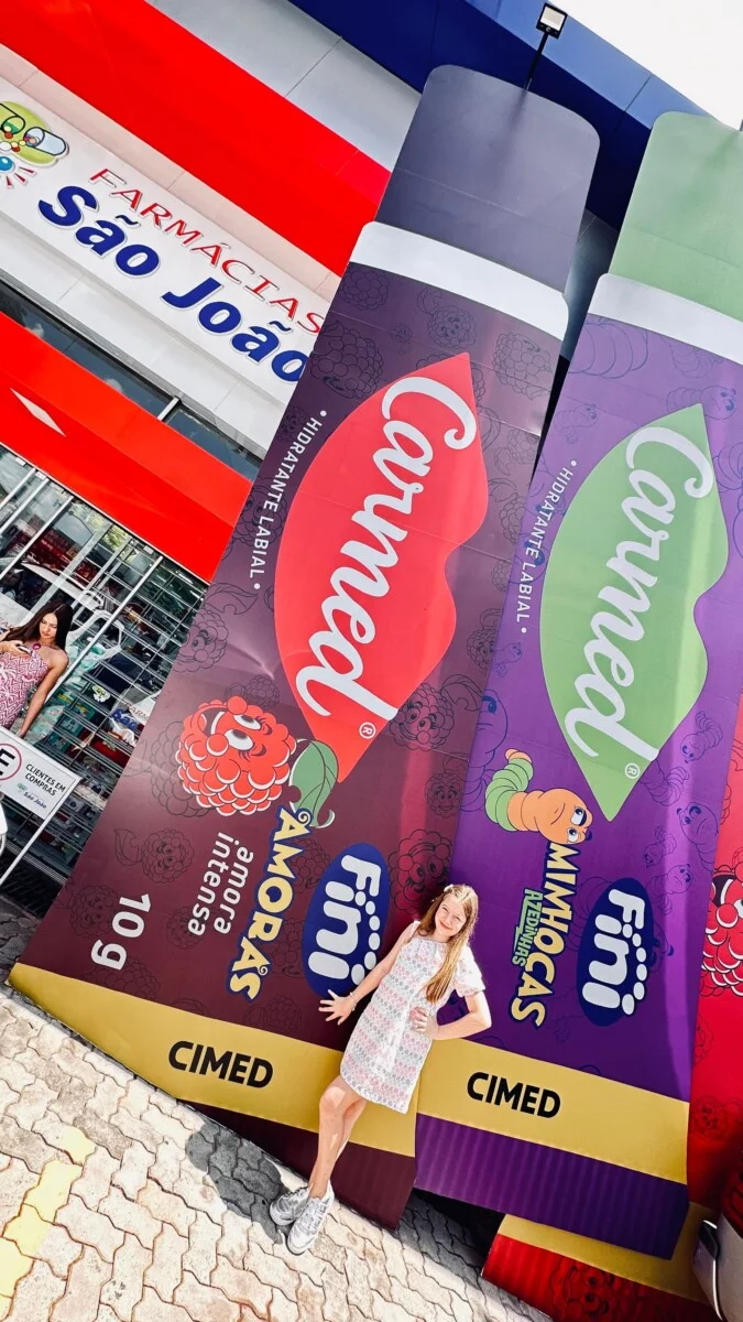 As irmãs Maria Antônia e Maria Gabi participaram da inauguração da 1ª loja conceito da Carmed no Sul do Brasil. Foi na quarta-feira (30), em uma das unidades das Farmácias São João, no bairro Boqueirão, em Passo Fundo. A fachada do estabelecimento ganhou elementos visuais da famosa marca de hidratantes labiais.