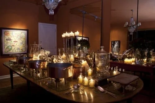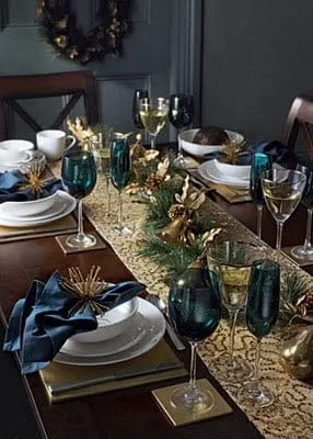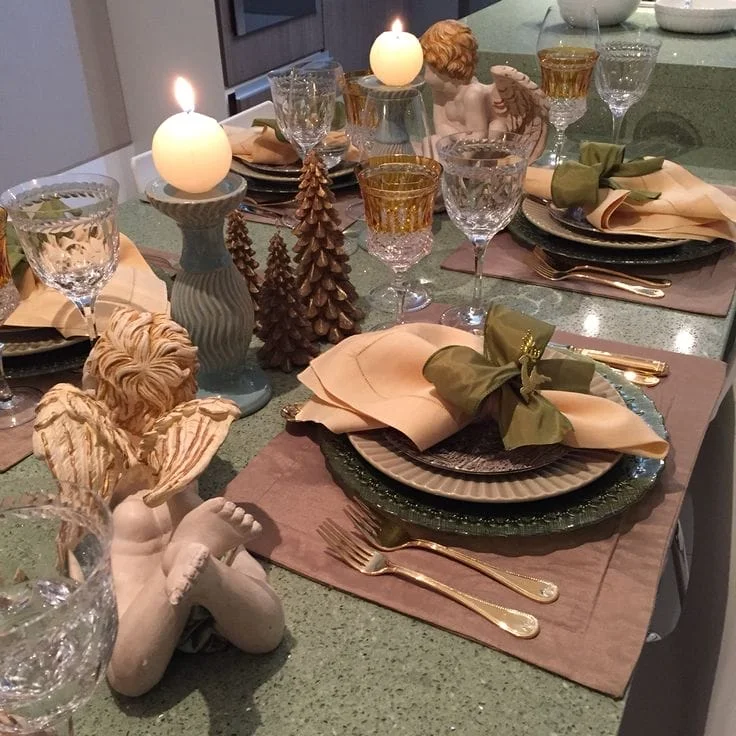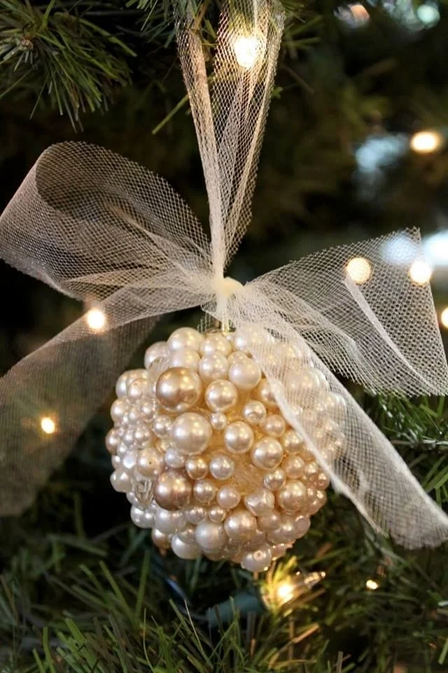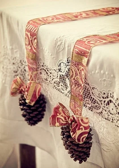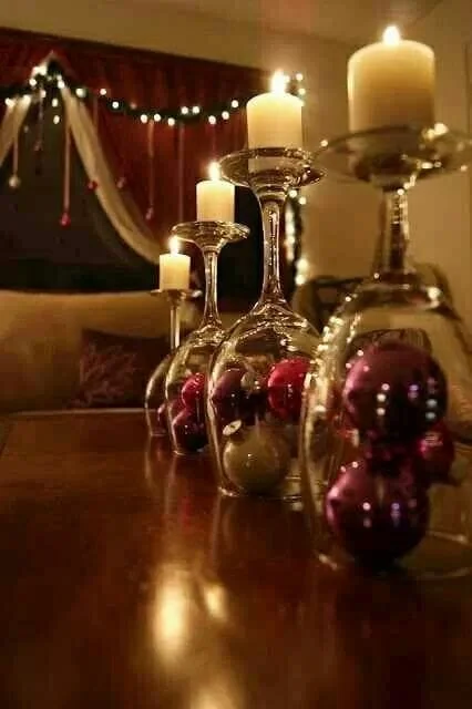 Taças de vinho como castiçais, bolas de isopor coladas com pérolas, e pinhas e laços na mesa.