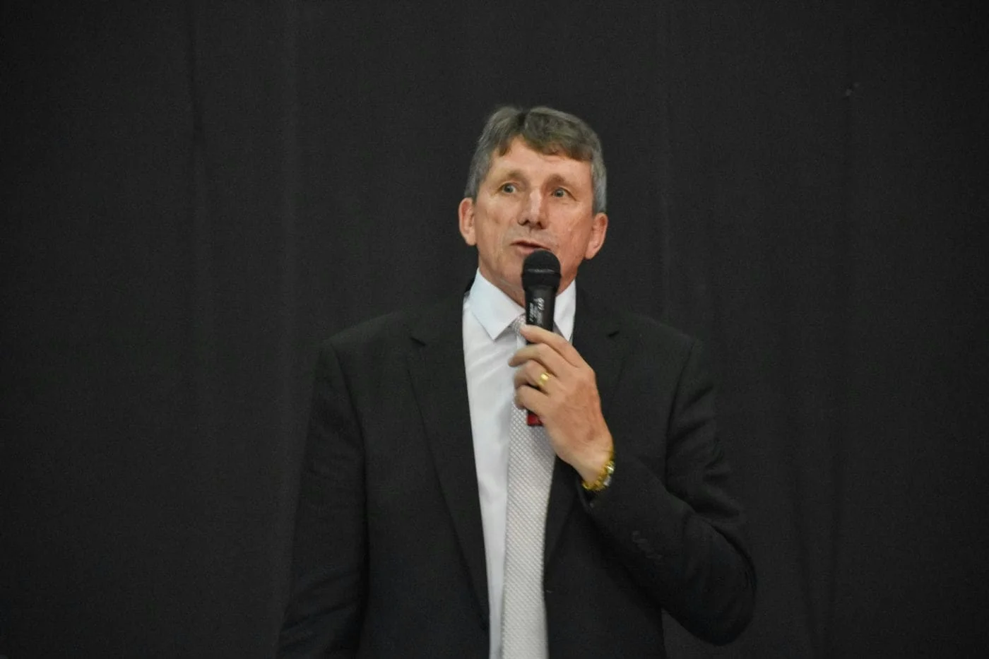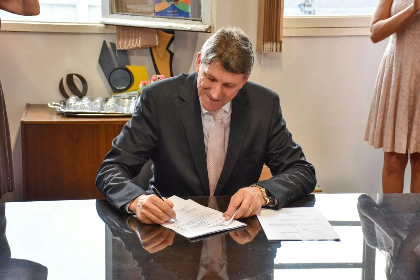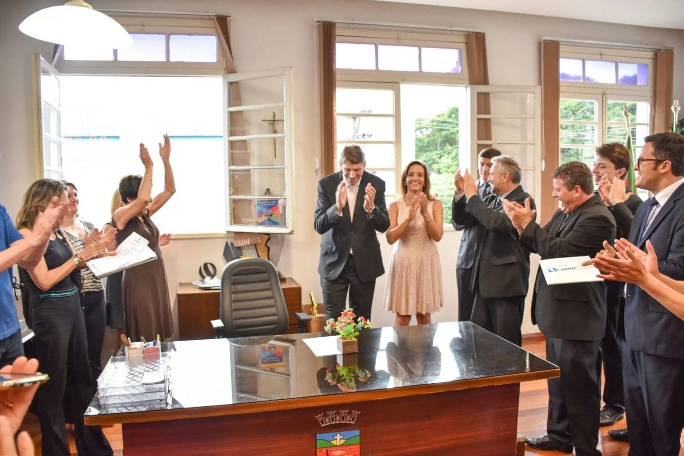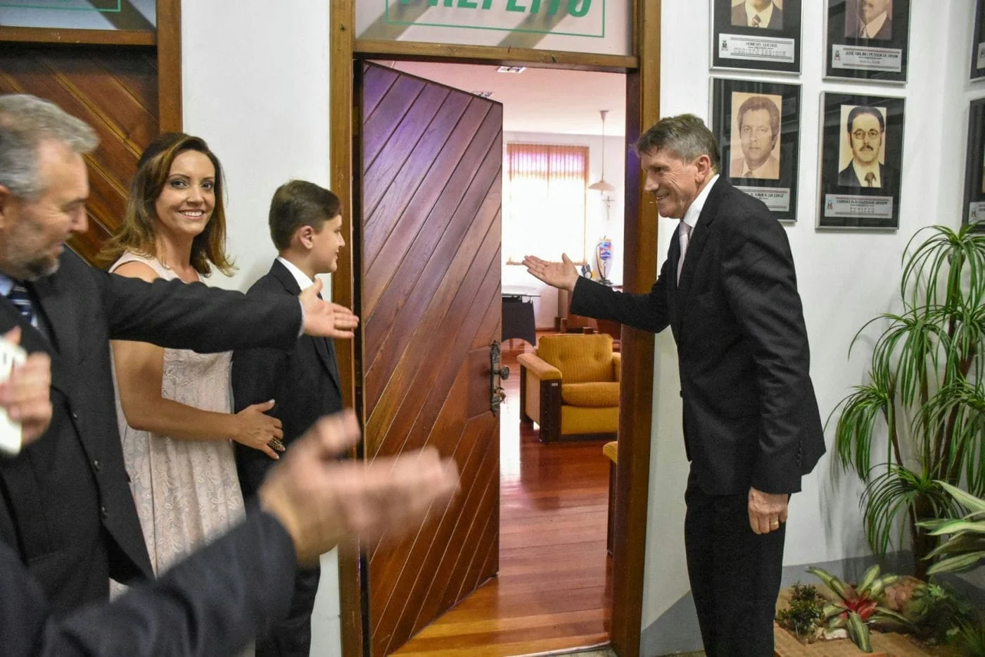 Acompanhado da família e do presidente do PMDB Ermógenes Bodanese, prefeito Milton Schmitz subiu as escadarias internas da prefeitura se dirigindo ao gabinete