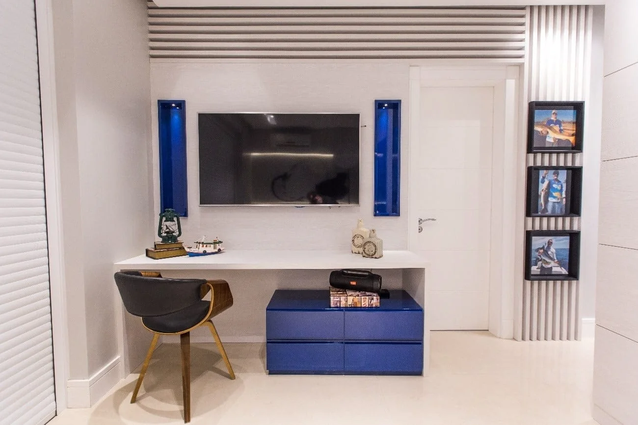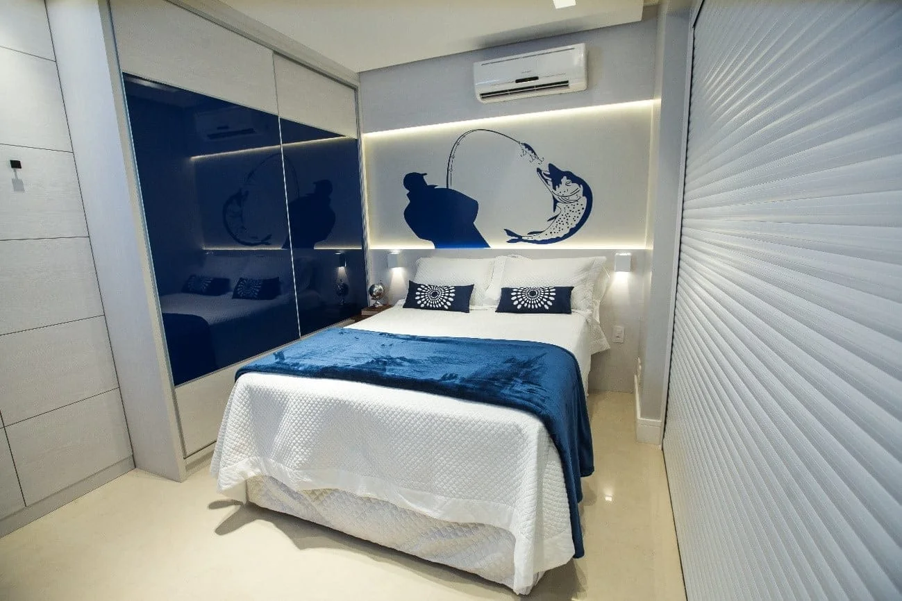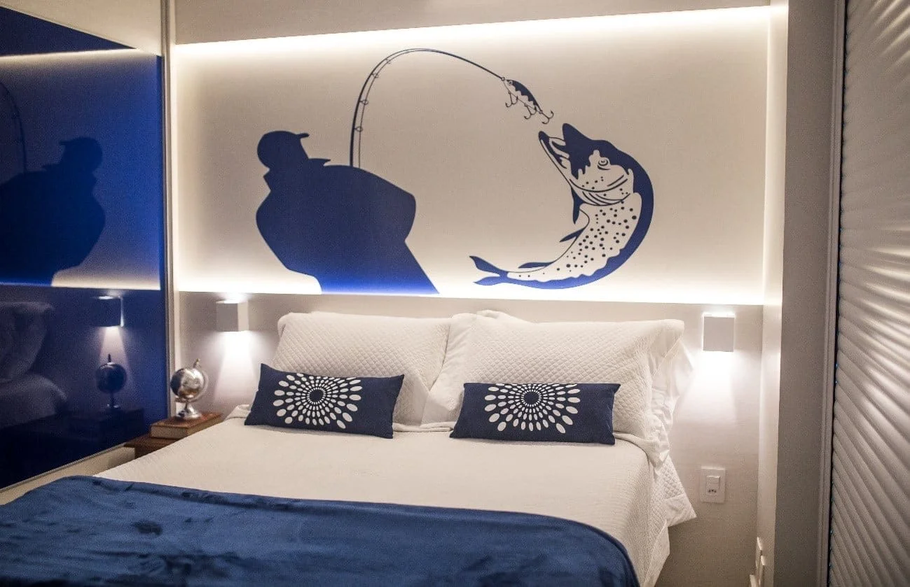 Meu cliente ama cinema e pesca esportiva, suas duas paixões. Então escolhi trabalhar com um quarto temático, no motivo PESCA, trazendo uma imagem adesivada na parede da cabeceira. Algumas fotos das suas pescarias foram enquadradas em um painel e a cor azul, é claro, para lembrar a água dos rios.