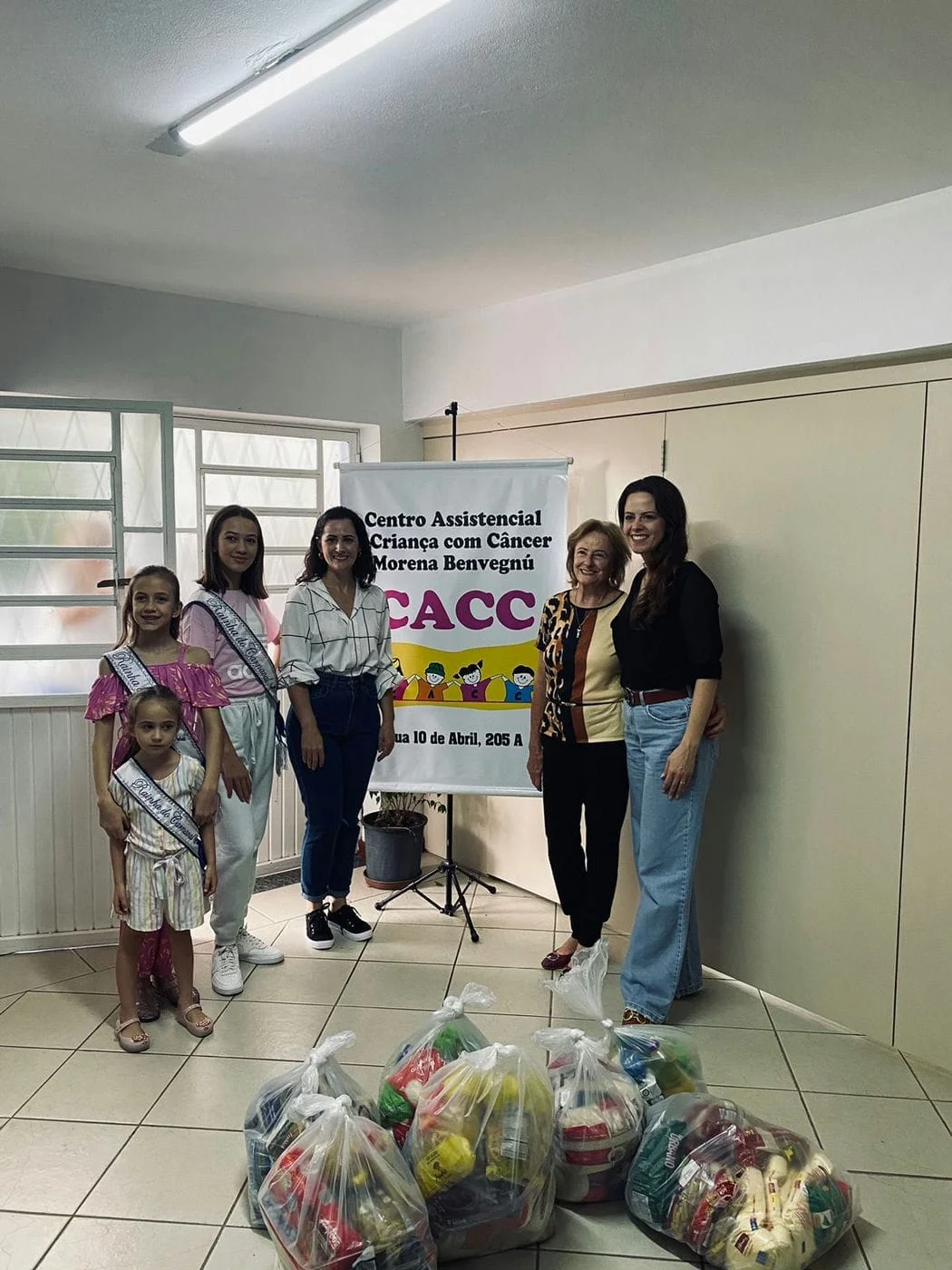 Uma das funções de uma rainha é estar presente onde os outros mais precisam. Por isso, no último dia 13, as rainhas do Clube Comercial, entre elas Maria Gabi, visitaram o Centro Assistencial à Criança com Câncer (CACC) de Passo Fundo, mantido pela Liga Feminina de Combate ao Câncer. Na ocasião, as meninas, acompanhadas da vice-presidente Social, Ana Paula Wickert, fizeram a doação de cestas de alimentos.