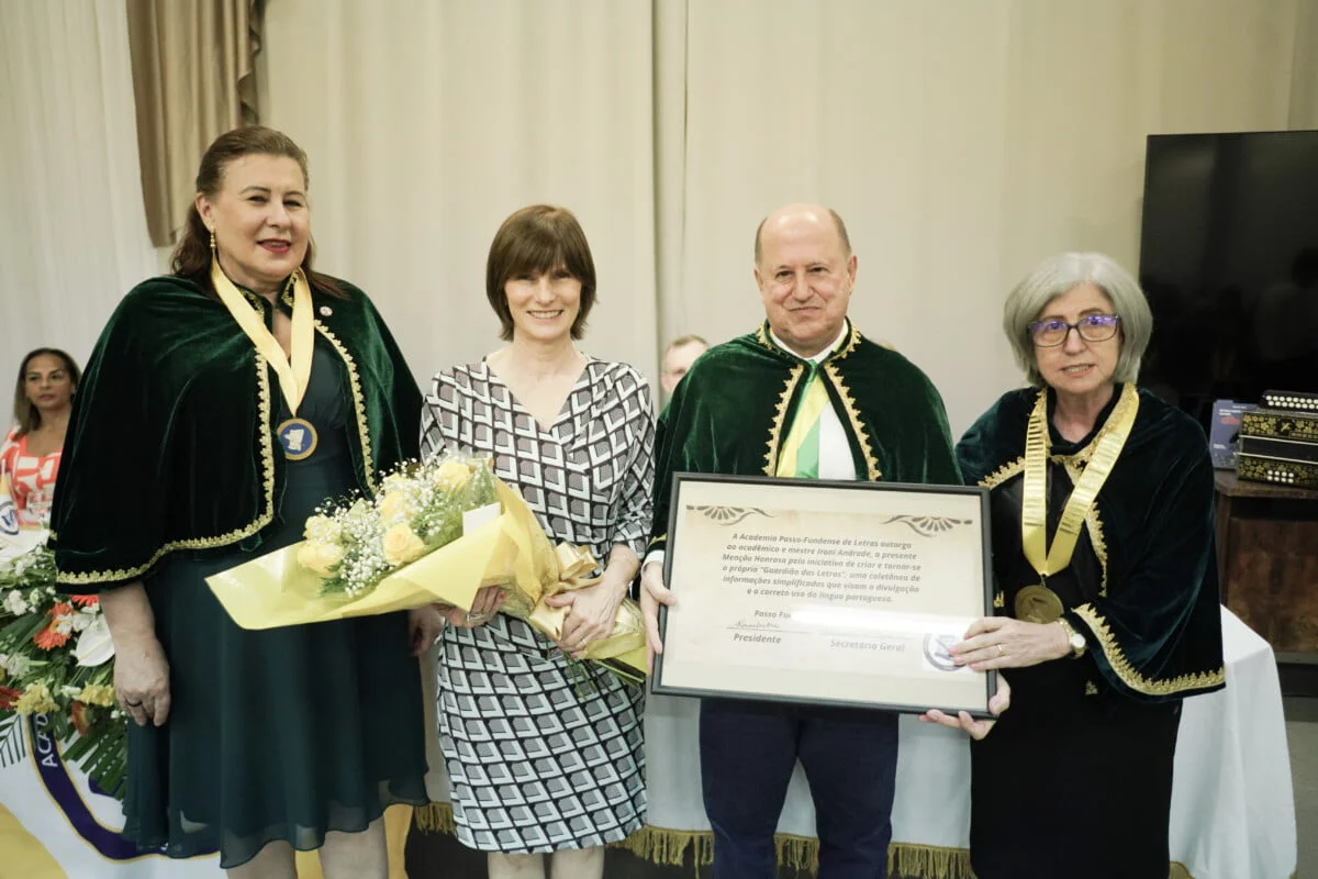 Ironi Andrade recebe título de “Guardião das Letras” — (esq.) Dilse Corteze, primeira-tesoureira; Maria Inez de Andrade, esposa de Ironi Andrade; Ironi Andrade, vice-presidente da APLetras; Antonieta Rovena Oliveira Gonçalves Dias, presidente da APLetras