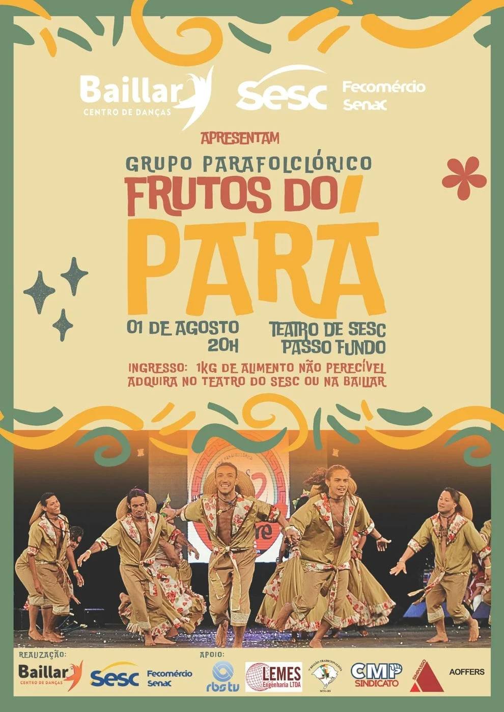 Com mais de 30 anos de tradição, o Grupo Parafolclórico Frutos do Pará retorna a Passo Fundo para a realização de um espetáculo público de danças típicas, no dia 1º de agosto, às 20 horas, no Teatro do SESC Passo Fundo. A Baillar Centro de Danças e o SESC são os responsáveis pela promoção do evento, e os ingressos antecipados já podem ser adquiridos através da doação de um quilo de alimento não perecível nas secretarias da escola e da instituição.