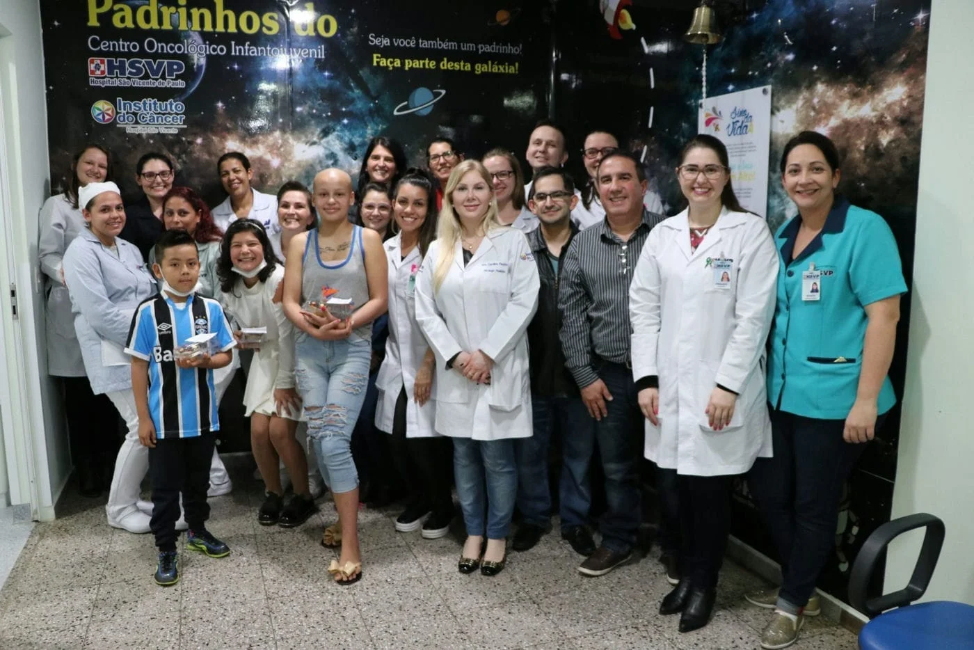 O momento de alegria para pacientes e famílias além da presença da equipe multiprofissional do Centro Oncológico, do presidente do HSVP, José Miguel Rodrigues da Silva, contou também com o superintendente executivo Ilário De David, Diretor Técnico Médico, Adroaldo Baseggio Mallmann, vereador e apoiador do Centro Oncológico, Saul Spinelli, Gerente de Recursos Humanos Jairo Davoglio, integrantes do NCI, residentes e preceptores da Residência Multiprofissional em Atenção ao Câncer e colaboradores do HSVP.