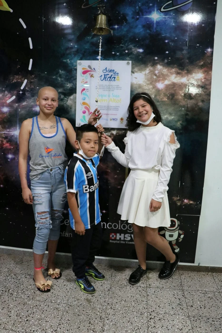 O silêncio dos corredores, os bipes das bombas de infusão e a conversa nos quartos foram abafadas pelo tilintar de sino, seguido por sons de choro e palmas. A terça-feira, 23 de julho de 2019, não era nem de longe, um dia comum no Centro Oncológico Infantojuvenil do Hospital São Vicente de Paulo (HSVP) de Passo Fundo. O som do sino convidava as pessoas a se aproximarem e descobrir o que acontecia. O dia era de celebração, três pacientes Quetlin Cristina Flores Hoffmann, Michael Vitorino Eufrasio e Karen Eduarda de Morais encerravam o ciclo de quimioterapias e venciam uma das batalhas na luta contra o câncer. Quetlin 13 anos e Michael 9 anos, lutam contra Leucemia e Karen 16 anos contra um câncer no útero.