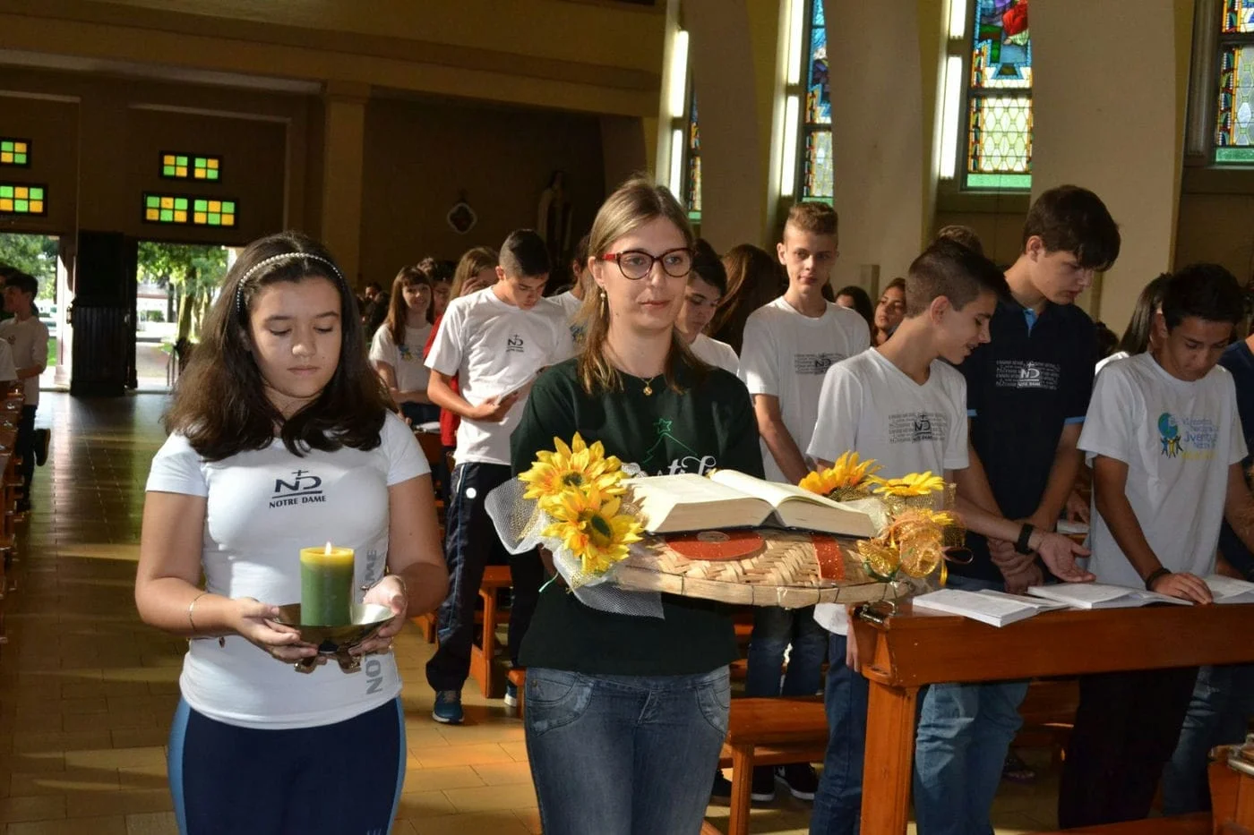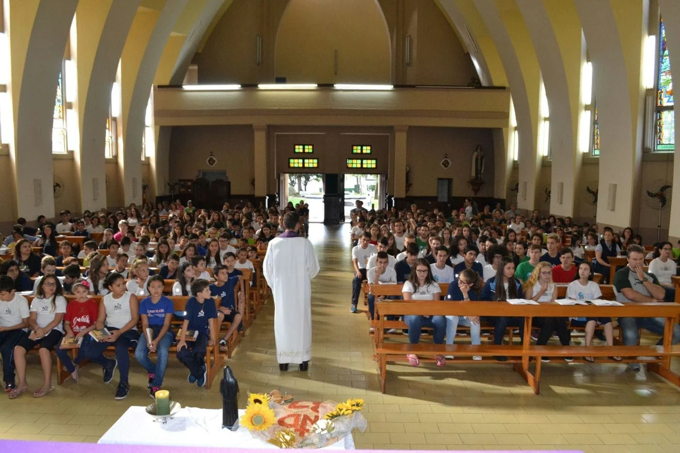 Pela manhã, estudantes e educadores participaram de uma celebração eucarística, realizada na Igreja Matriz Nosso Senhor Bom Jesus. Durante a missa, presidida por Padre Mateus Danieli, a comunidade educativa relembrou e agradeceu, em meio a orações e cantos de louvor, a trajetória educacional do Colégio.