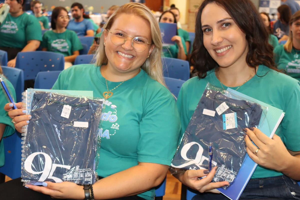 Igualmente homenageados pela instituição de ensino, os educadores foram presenteados com caderno e caneta alusivos ao 95º aniversário, bem como pela camiseta que vestiriam para, na terça-feira (11), abrirem seus braços aos educandos. Também trocando abraços com os colegas, os educandos Notre Dame celebraram animadamente o início do ano letivo.