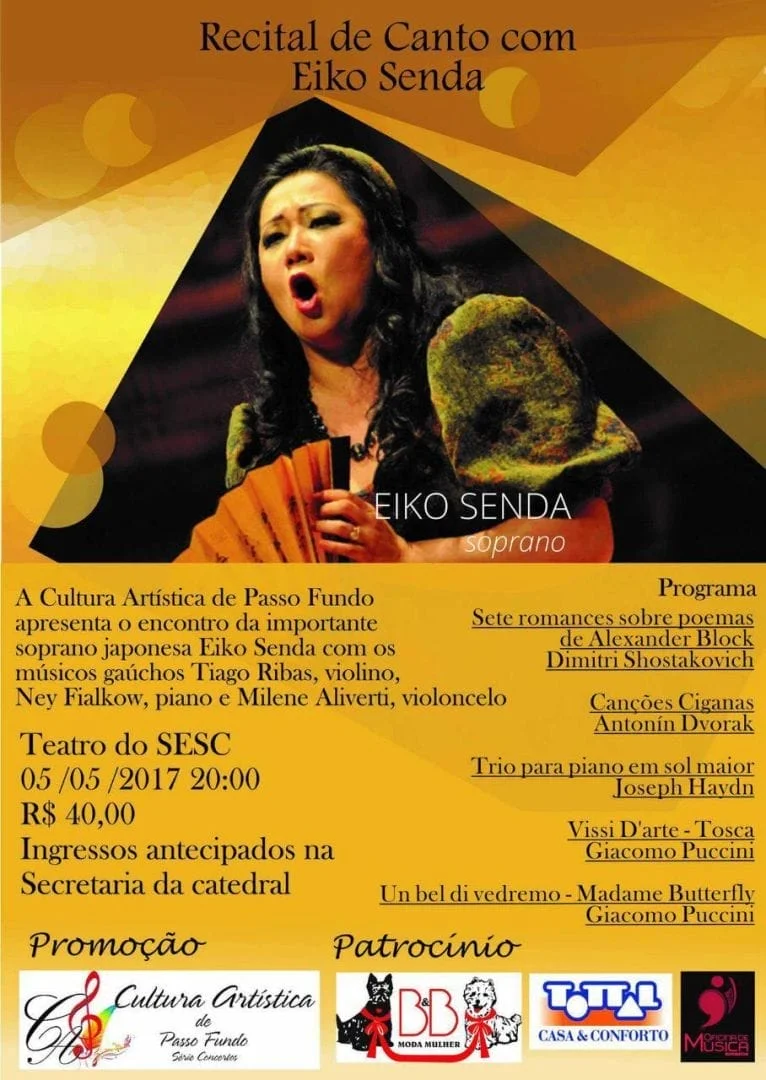 O próximo deles será um belíssimo recital de canto com Eiko Senda e convidados, no dia 5 de maio, às 20h, no Teatro do Sesc Passo Fundo. Eiko, nascida no Japão, fez sua formação no Japão e Alemanha como cantora solista e pedagoga, ganhou diversos prêmios em concursos internacionais. Transferiu-se para o Brasil em 1995, assumindo papéis de soprano-spinto nos principais teatros do país. Eiko já protagonizou nos países, diferentes produções de Madame Butterfly (110 vezes), Tosca, Salomé, Tristão e Isolda e Elektra. Por essas e outras interpretações, tem recebido excelentes críticas internacionais em publicações como o jornal The New York Times e as revistas Opernwelt e Opera. Atualmente reside em Montevideo. Em março de 2016 recebeu distinção da Federação de Mulheres para a Paz Mundial por seu aporte à causa da PAZ.