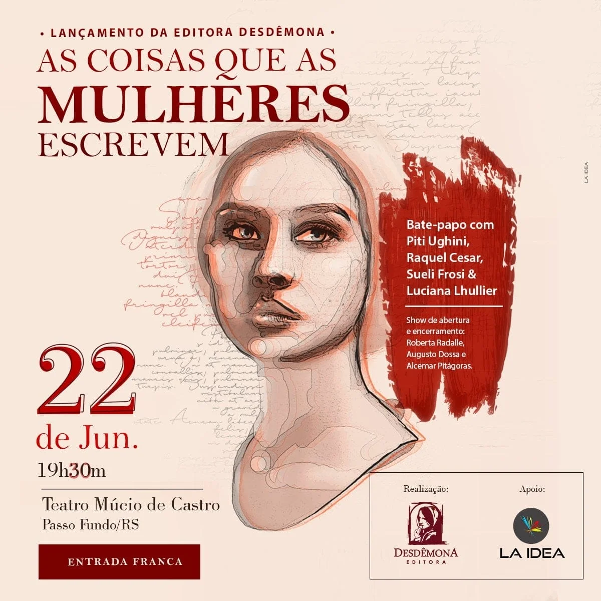 Na ocasião, além da própria Luciana Lhullier, estarão presentes a escritora e professora Piti Ughini, a autora Sueli Frosi e a doutoranda em Letras, pela Universidade de Passo Fundo, Raquel Cesar. O encontro irá discutir quais são as mulheres que as inspiraram a escrever, e terá apresentação da cantora Roberta Radalle e dos músicos Augusto Dossa e Alcemar Pitágoras. O evento é gratuito, mas é preciso garantir o convite na Biblioteca Pública Municipal Arno Viuniski ou na Livraria Delta.