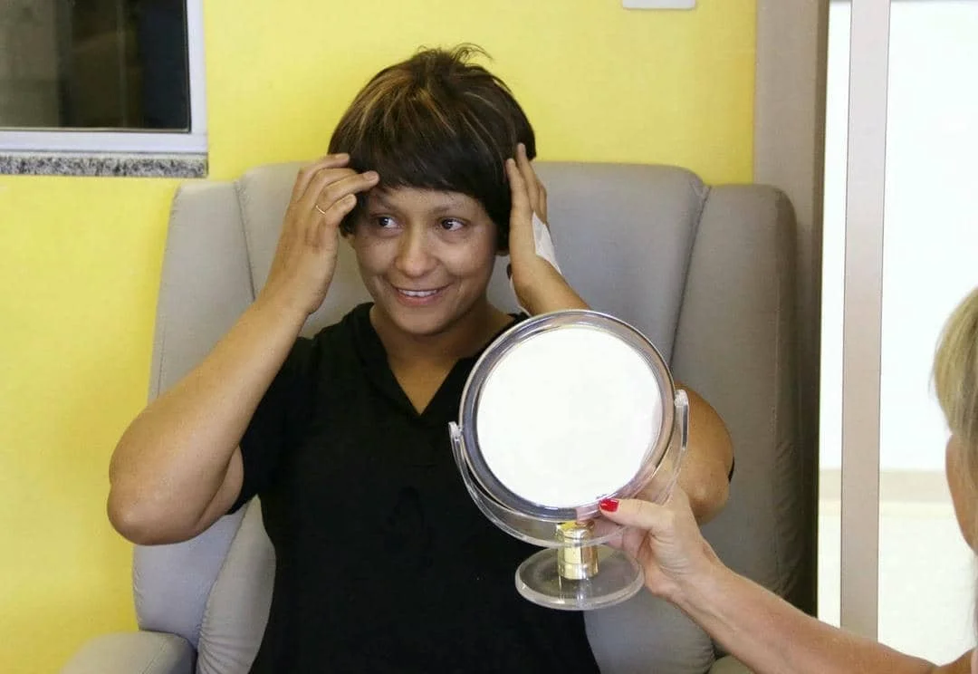 Durante a tarde de beleza Zaira provou outras perucas. Uma curtinha e outra com fios longos, franja e mexas, que acabou ganhando de presente da Liga. Ela inspirou a Cerenita, que nunca havia provado uma peruca, a tentar o novo visual, que foi aprovado por ela e todas na sala. “Na segunda semana de tratamento o meu cabelo começou a cair, um fiozinho aqui, depois maços no travesseiro e durante o banho também caia muito. Aí eu resolvi rapar, já que estava caindo tudo mesmo. Eu só usava lenço”, conta Cerenita, que mora no interior de Não-Me-Toque, em Linha Gramado. A Presidente da Liga, Jussara, brincou pedindo se ela teria coragem pra sair assim de lá e a resposta dela fez todas na sala ficarem ainda mais felizes: “Eu tenho coragem pra tudo!”.