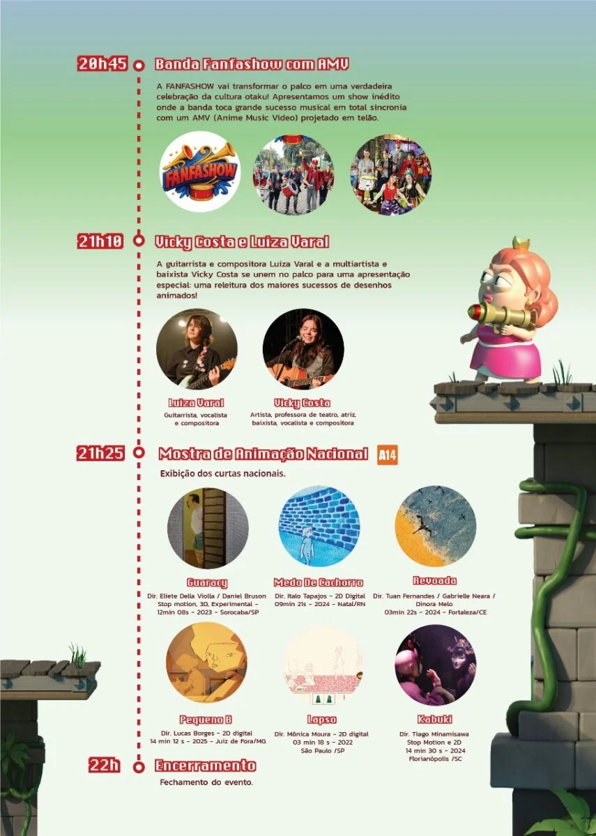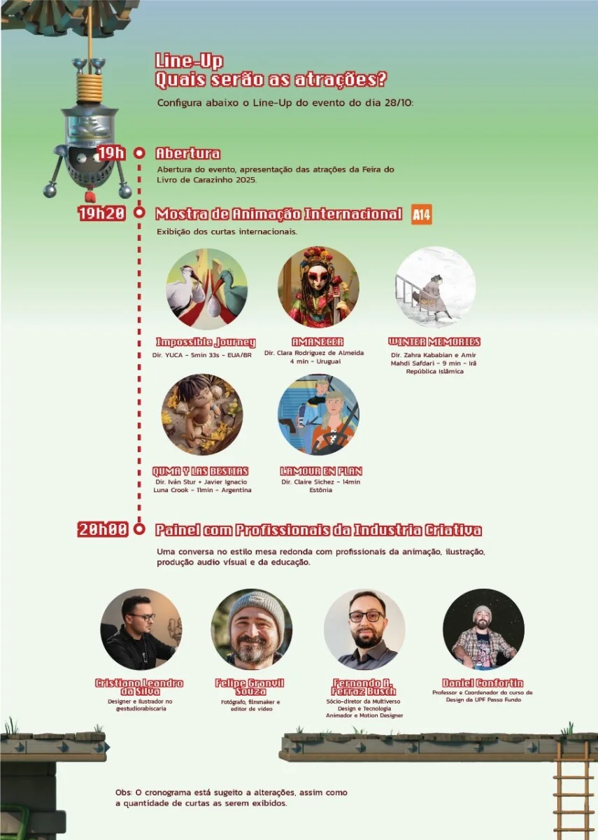 No dia 28 de outubro, terça-feira, a partir das 19h, o Sesc Carazinho será o ponto de encontro para todos que amam animação. “Nossa exibição principal é a oportunidade perfeita para você se conectar com a arte, assistir a curtas fantásticos e ainda conhecer de perto profissionais da indústria criativa. Para deixar a noite ainda mais especial, teremos duas apresentações musicais que prestam uma linda homenagem às animações”, destacam os organizadores.