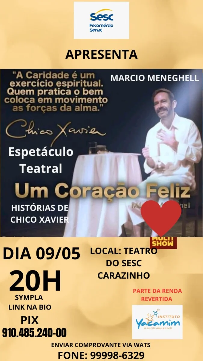 Unindo cultura e solidariedade, no dia 9 de maio, sexta-feira, o teatro do Sesc Carazinho será palco do espetáculo “Um Coração Feliz — Histórias de Chico Xavier”, apresentado por Márcio Meneghell. O ator, em parceria com o Instituto Yacamim, promove o espetáculo que terá parte da sua renda revertida para o instituto.