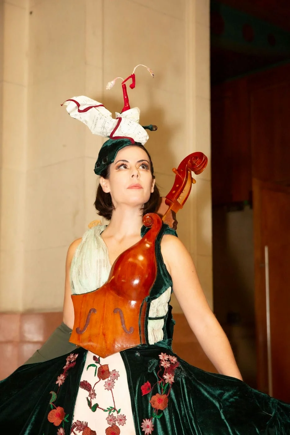 Para conseguir realizar sozinha uma peça que normalmente exige o trabalho de uma companhia teatral inteira, Nina partiu do conceito de que todas as personagens da peça compartilham o mesmo espaço cênico – a floresta musical – representada na forma de um figurino estendido, que também é cenário e palco. “Esse figurino, cujo corpo é formado por peças de violino desenhadas, esculpidas e confeccionadas sob medida para o espetáculo, pelos irmãos luthiers Rogério e Fernando Fagundes, ganham vida durante o espetáculo”, conta a artista. Seu vestido possui grandes bolsos ocultos de onde também saem alguns personagens da fábula. A concepção, design, criação e execução deste “vestível” são assinados pela artista Nina Vogel.