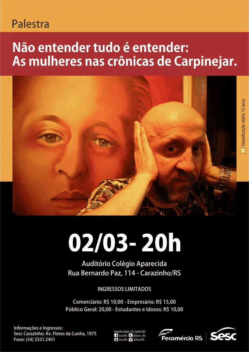 Em comemoração ao Mês da Mulher, o SescCarazinho realiza um bate papo com o poeta, cronista, jornalista e professor Fabrício Carpinejar. Com o tema “Não Entender Tudo é Entender: As Mulheres nas Crônicas de Carpinejar”, ele estará em Carazinho no dia 02 de março, quarta-feira, às 20h, no Auditório do Colégio Aparecida. A palestra terá duração de 1h e classificação etária de 12 anos.