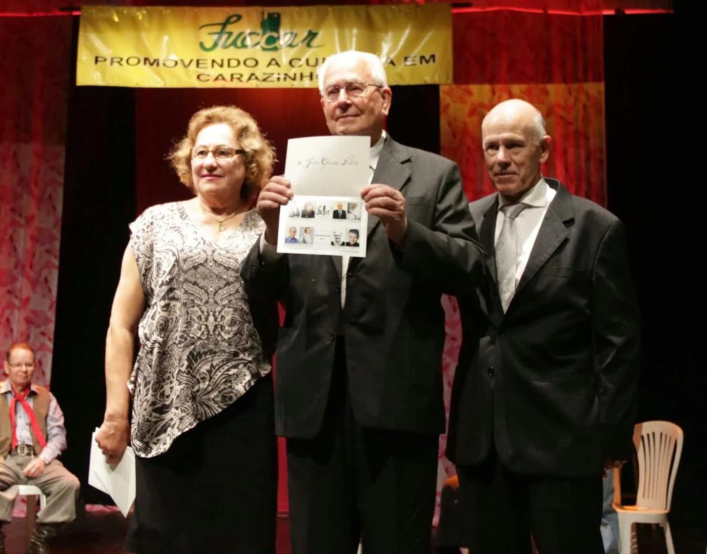 Entre as apresentações foram homenageads: o Padre João Gheno Netto, autoridade religiosa; Luís Tadeu Piva, serviço social; Osmar Cordella, administração; Maria Beaty Ott, educação; Dilon Pias Duarte, escultura; Mario José Bandeira, tradicionalismo; Alda Schiper, cultura; e Marlene Fritscher Müller, organização e projetos. Em nome dos homenageados, Marlene parabenizou todas as administrações da Fuccar e agradeceu a homenagem. “Fazer parte de uma entidade cultural é um motivo de orgulho, mas também de dever. Devemos somar esforços para fortalecer ainda mais esta entidade que é privada e sem fins lucrativos para fazê-la crescer ainda mais. A Fuccar caminha serenamente organizada e hoje o que lhe falta? Um espaço apropriado para melhor desenvolver suas atividades e englobar todas as artes de nossa cidade e isto chamamos de Casa de Cultura. Quiçá, isso se concretize um dia e nós ainda possamos ver! Porque, como diz o Frey Betinho, ‘O país não muda pela sua economia, sua política, e nem mesmo sua ciência, muda, sim, pela sua cultura’”, enfatizou Marlene.