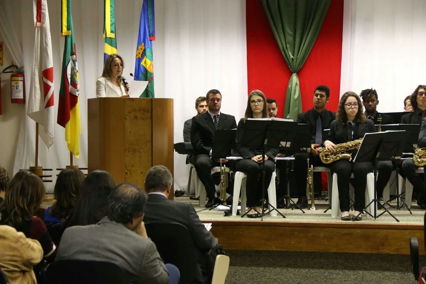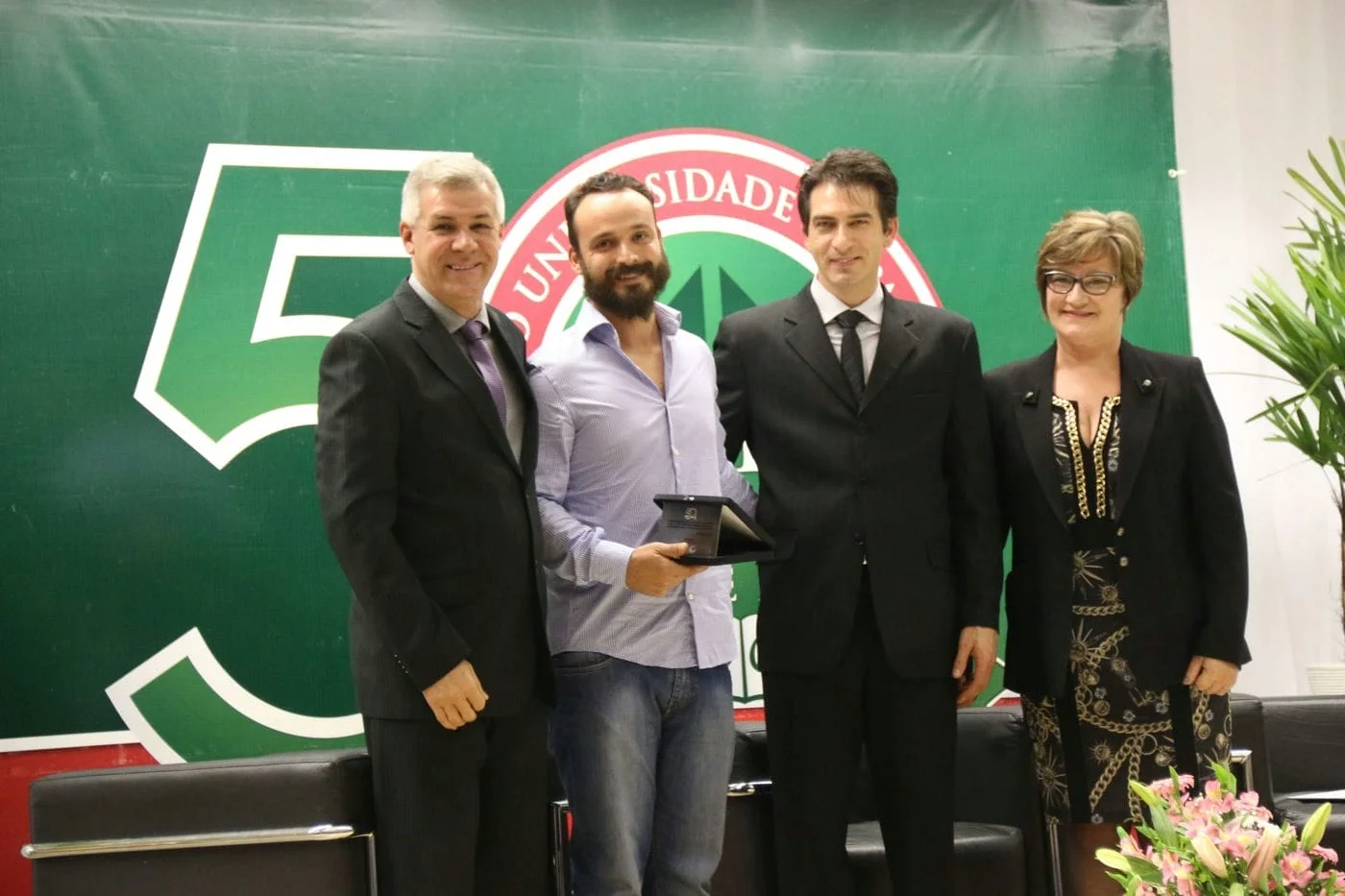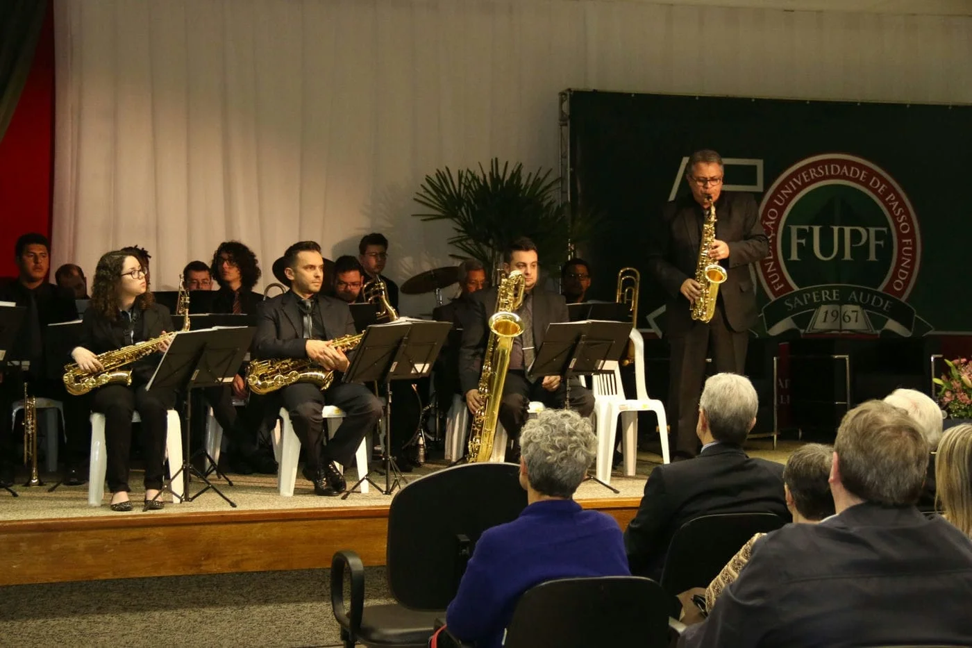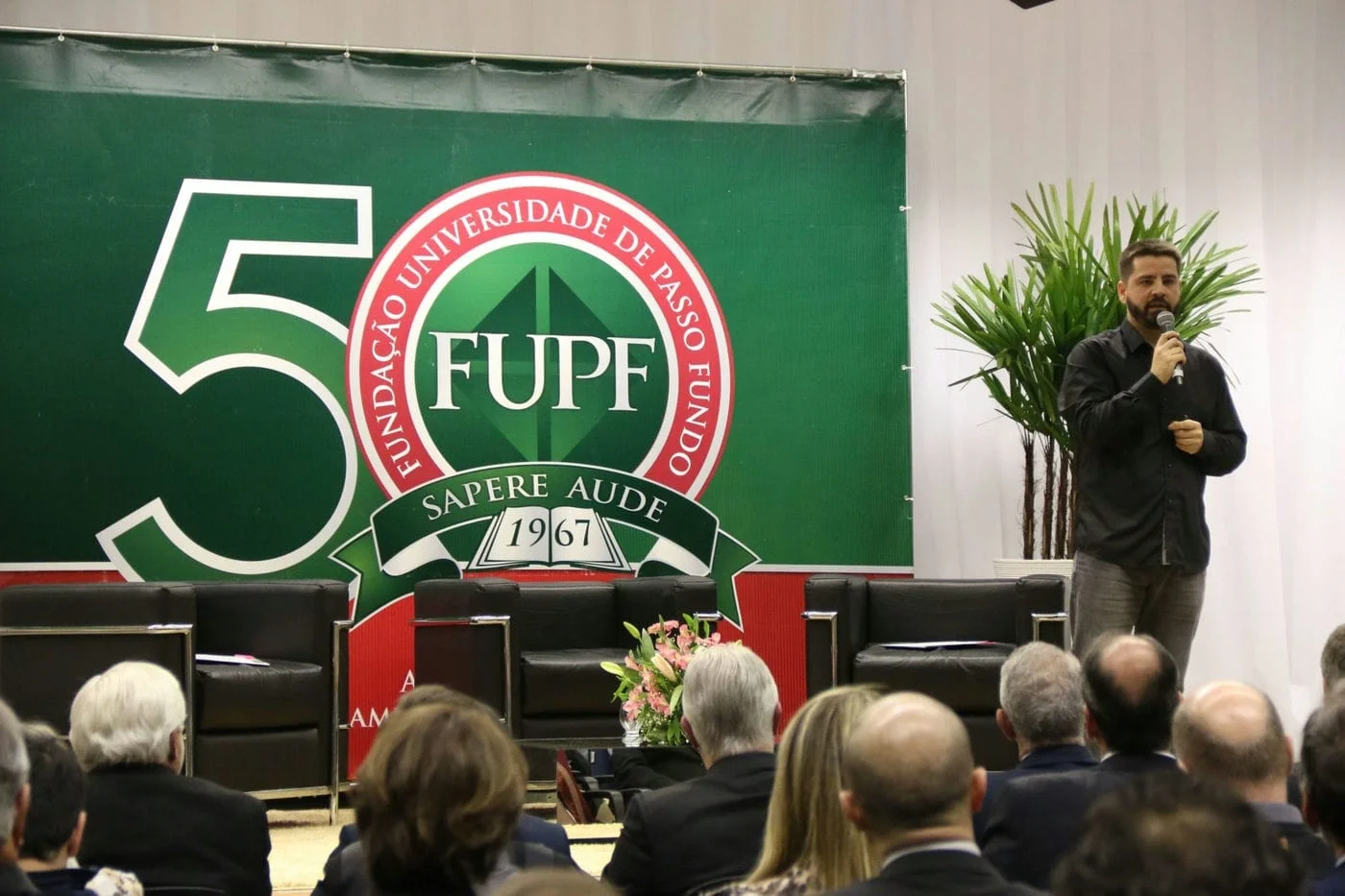 A big band da Universidade iniciou a programação da noite com uma bela apresentação, sob a regência do maestro Rodrigo Ávila. O professor Olmiro Schaeffer apresentou o brasão dos 50 da fundação criado pelo professor Luis Alfredo Hofmann Junior, que une a Universidade, o Centro de Ensino Médio Integrado e a UPF Idiomas. “O círculo sugere a união das pessoas que participaram da fundação. O lema “Sapere Aude” significa “ouse saber” e também lembra a ousadia das pessoas que fundaram a fundação, que ousaram transformar a comunidade através do conhecimento”, explicou.