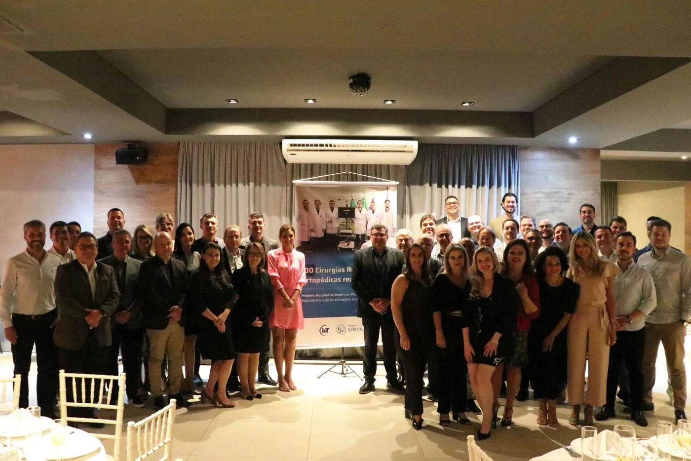 Para registrar o sucesso dos 100 procedimentos ortopédicos por meio de robótica, nesta segunda-feira, 27, as Instituições parceiras organizaram um jantar de confraternização das equipes médicas e multiprofissionais com as empresas que fabricam e comercializam o robô no país. O evento no Clube Comercial contou com a presença de Manny Fuentes, diretor da Smith e Nephew na América Latina, juntamente com o seu diretor comercial do Brasil, Gustavo Garrido, e o gerente de produtos, João Nobre. A empresa Medica também participou do evento com o diretor, Rafael Couto Ferreira, o gerente comercial, Paulo Prestes, e o representante comercial Paulo Simão. Na ocasião, foi feito um agradecimento especial aos diretores Estatutários e Executivos do HSVP, a todos os médicos e residentes do Corpo Clínico do Hospital e da Clínica IOT, enfermagem e aos demais colaboradores do serviço.