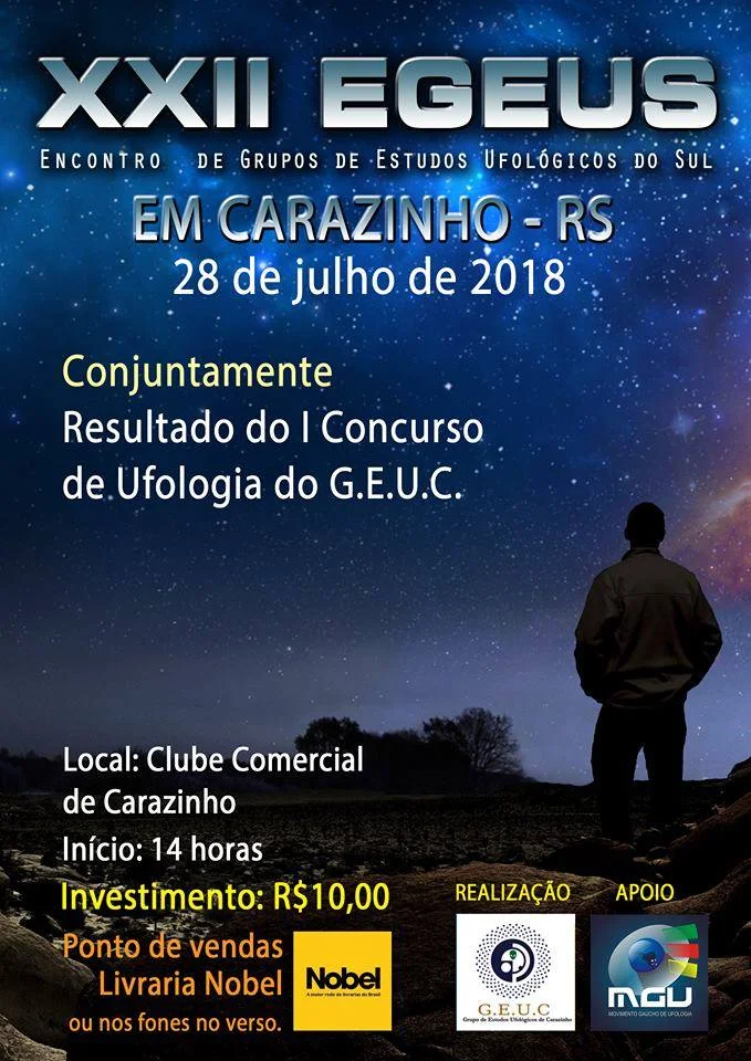 Será realizado no próximo sábado, dia 28 de julho, o XXII Encontro de Grupo de Estudos Ufológicos do Sul no salão social do Clube Comercial de Carazinho. O evento contará com a participação do historiador paulista André de Pierre, que está no estado realizando a 3º fase da expedição “Antigas civilizações no Brasil Pré-histórico”. André fará uma palestra no evento abordando a presença dos Sumérios e dos seus Deuses, chamados de Anunakis (aqueles que do céu vieram) no Brasil.