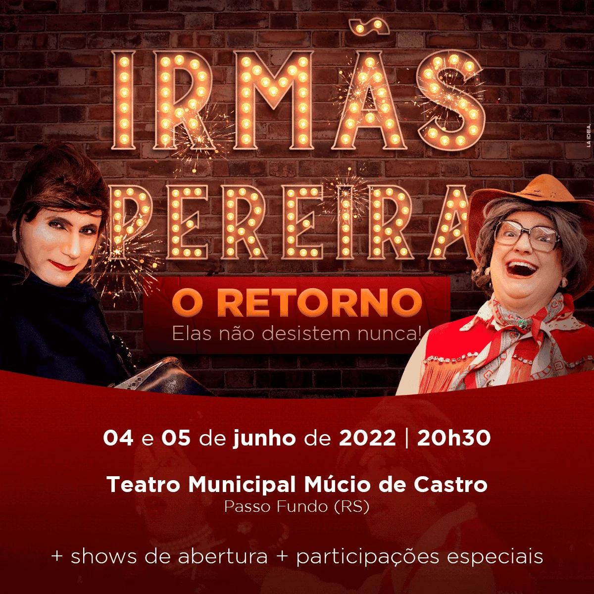 Respeitável público: as irmãs Pereira estão de volta! Nos dias 04 e 05 de junho, às 20h30, Dulce (Beto Mayer) e Pompéia (Tina Schell) prometem boas gargalhadas no palco do Teatro Municipal Múcio de Castro. “Irmãs Pereira: O Retorno” marca a retomada dessas personagens tão queridas, que, durante a pandemia, trouxeram alegria em transmissões ao vivo nas redes sociais.