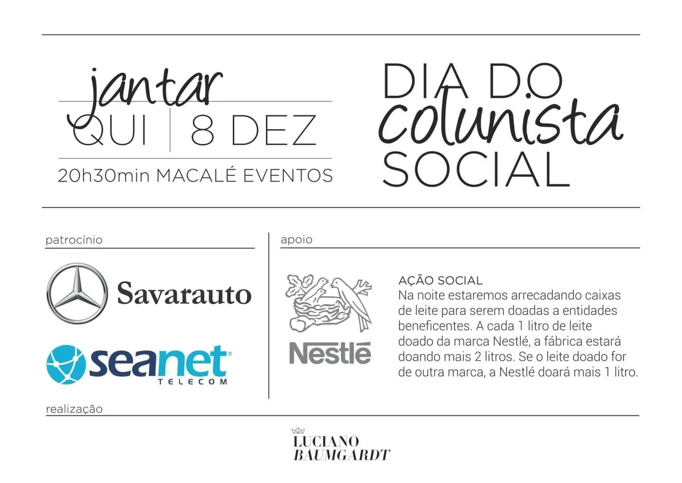 Luciano Baumgardt, colunista social da Revista Contato VIP, está promovendo uma comemoração pra lá de especial para celebrar o Dia do Colunista Social e todas as conquistas do ano de 2016. O jantar será neste dia 08 de dezembro, às 20h30, no Macalé Eventos e ainda restam alguns convites disponíveis.
