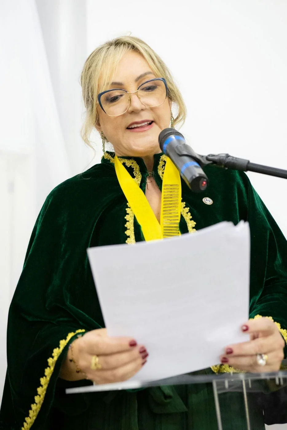Presidente da APLetras, Rovena Oliveira Gonçalves Dias, utiliza o tradicional malhete para encerrar a sessão de posse – Foto: Natália Bonissoni