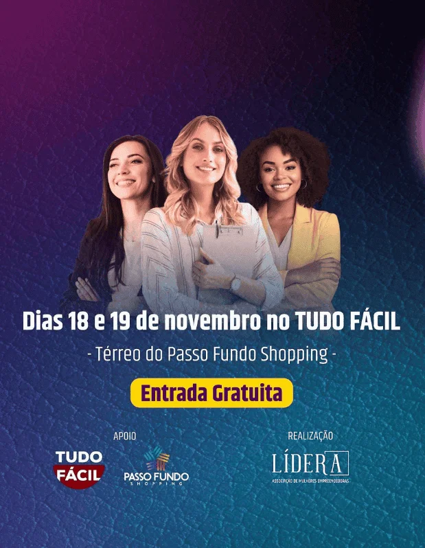 O evento é uma realização da Lídera – Associação de Mulheres Empreendedoras com apoio do Tudo Fácil e do Passo Fundo Shopping. Informações podem ser obtidas pelo e-mail lideramkt1@gmail.com ou através do Instagram da Lídera.