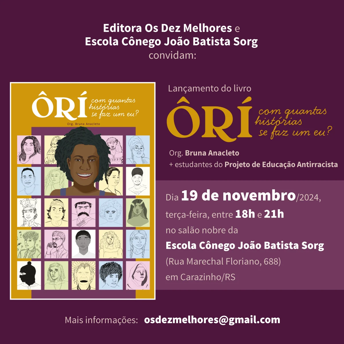 Ôrí também é o título do próximo lançamento da Editora Os Dez Melhores, que, não por acaso, acontece dia 19 de novembro, terça-feira, véspera do feriado do Dia Nacional de Zumbi dos Palmares e da Consciência Negra. A obra é o resultado final do Projeto de Educação Antirracista, atividade extracurricular capitaneada pela professora e historiadora Bruna Anacleto, envolvendo alunos do ensino médio da Escola Cônego João Batista Sorg, de Carazinho.