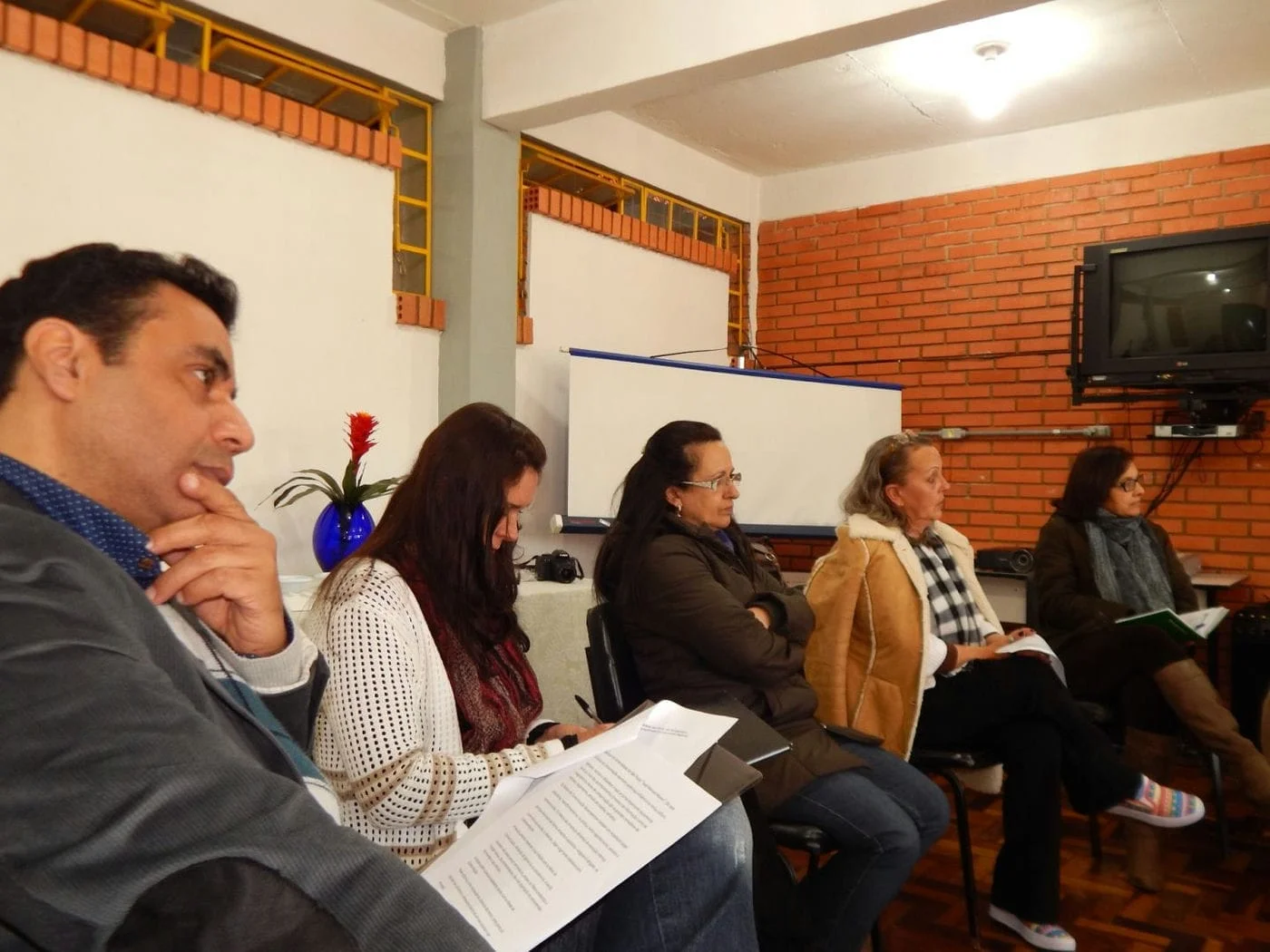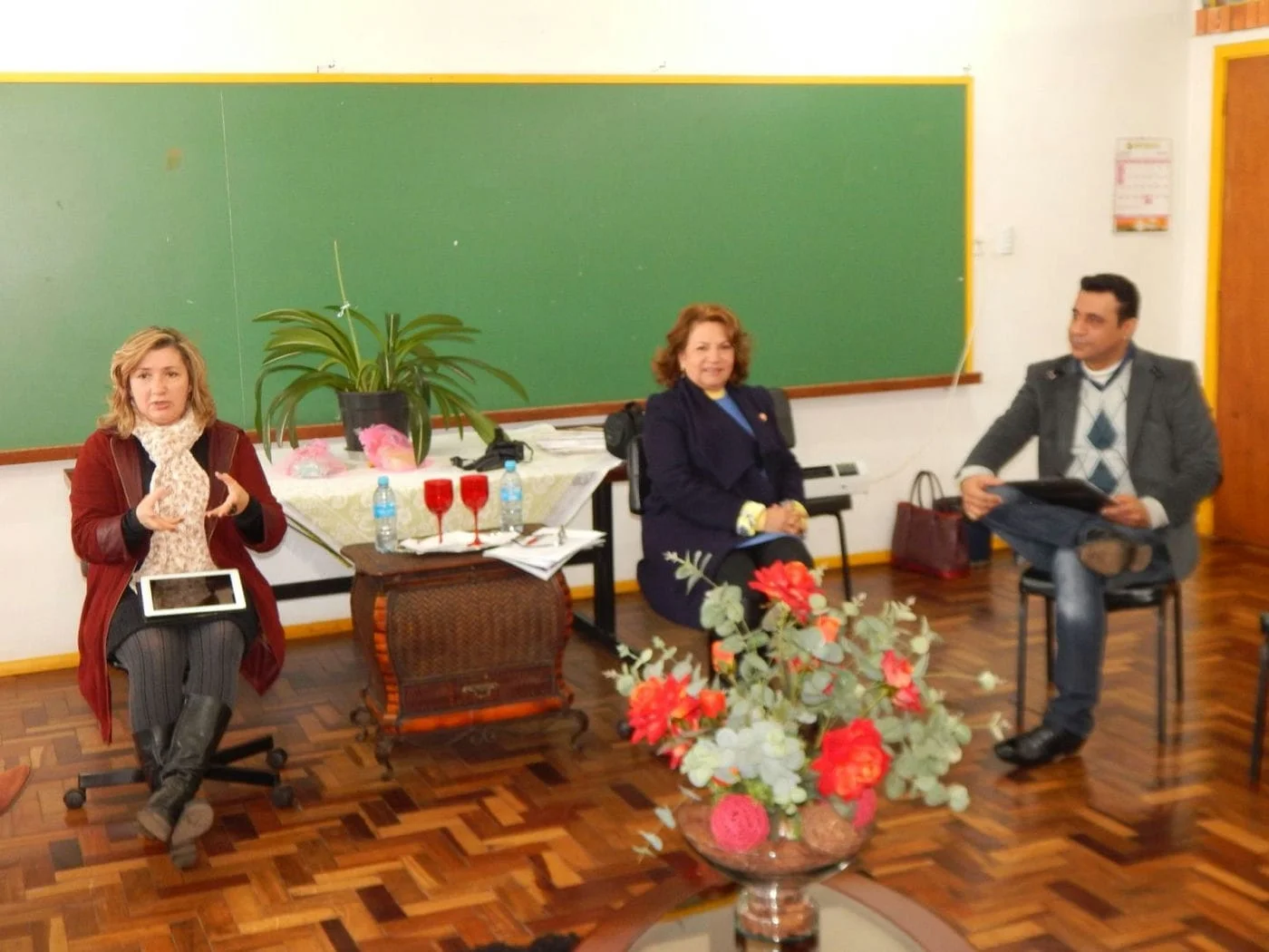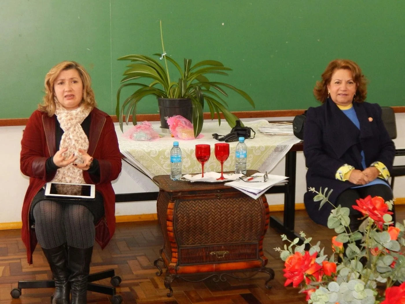 Nesta quinta-feira à tarde, 21 de julho, O Núcleo Estadual de Educação de Jovens e Adultos e de Cultura Popular Felipe Roberto Sehn realizou uma tarde de conversa com seus professores sobre o tema “A importância dos meios de comunicação na escola”. A jornalista Ana Maria Leal, do Grupo Gazeta, e a colunista social e radialista Terezinha Camargo, representando a Revista Contato Vip, foram as mediadores da conversa.