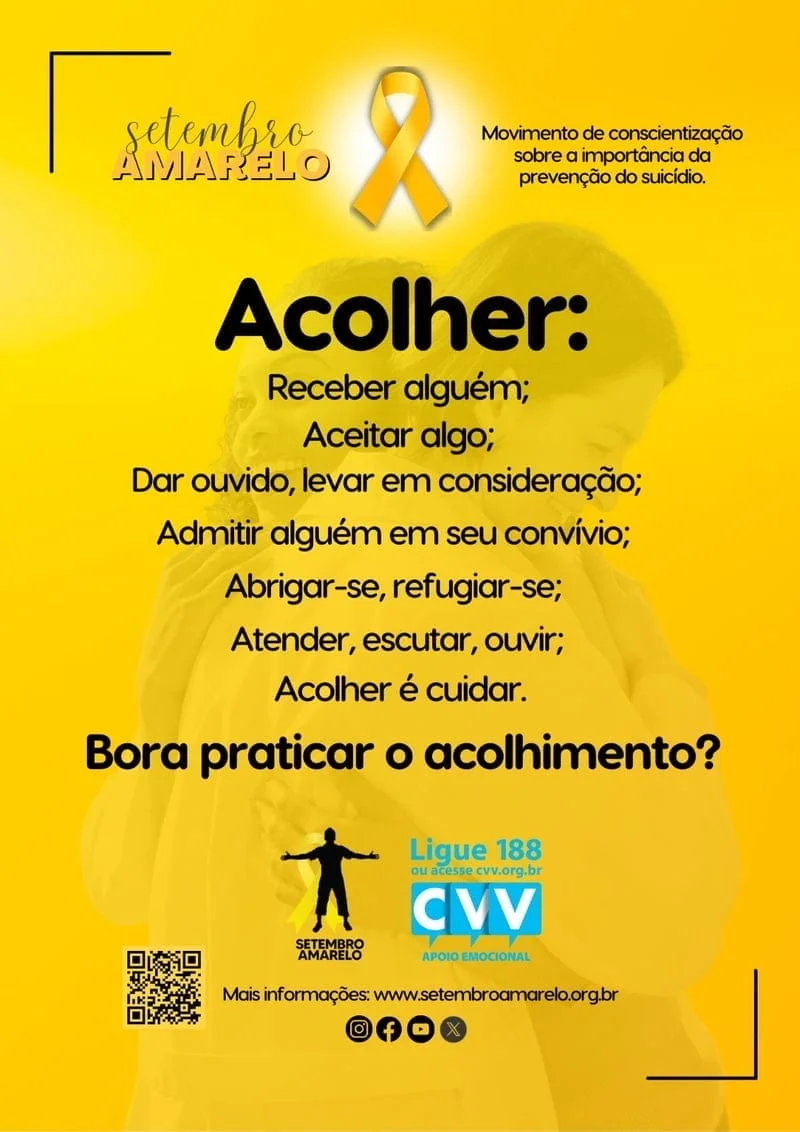 Cuidar de si próprio e das pessoas ao nosso redor sempre foi uma eficiente maneira de evitar desconfortos emocionais e amenizar os efeitos de alguns transtornos mentais. Com essa visão, o CVV definiu como tema deste ano do Movimento Setembro Amarelo “Acolher é cuidar”.