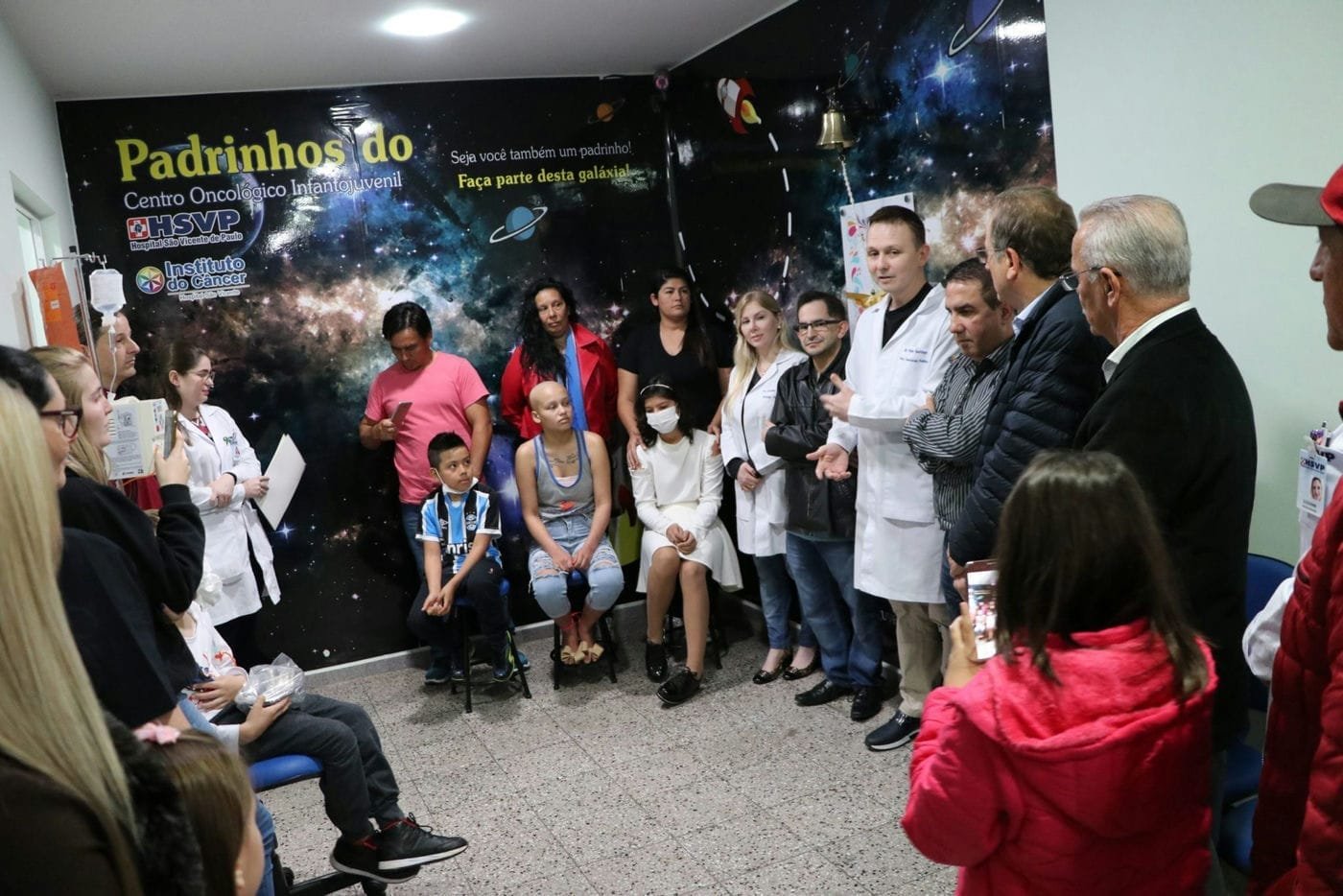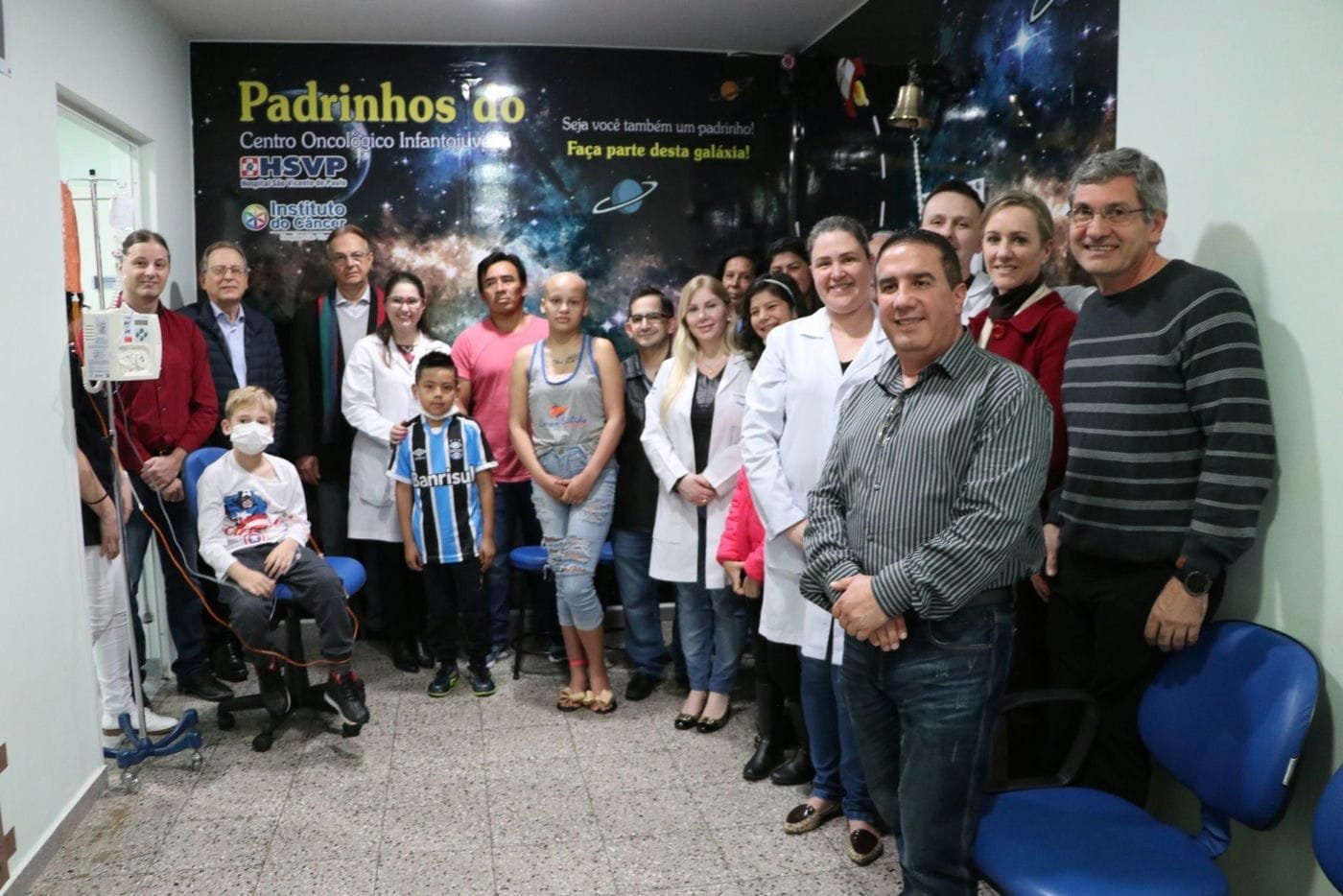 O momento de alegria para pacientes e famílias além da presença da equipe multiprofissional do Centro Oncológico, do presidente do HSVP, José Miguel Rodrigues da Silva, contou também com o superintendente executivo Ilário De David, Diretor Técnico Médico, Adroaldo Baseggio Mallmann, vereador e apoiador do Centro Oncológico, Saul Spinelli, Gerente de Recursos Humanos Jairo Davoglio, integrantes do NCI, residentes e preceptores da Residência Multiprofissional em Atenção ao Câncer e colaboradores do HSVP.