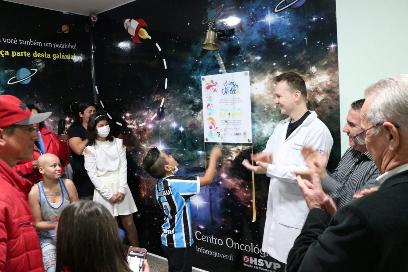 O presidente do Hospital São Vicente, José Miguel Rodrigues da Silva lembrou o significado do sino na história e como o som dele marca a vitória e conquista de um objetivo. “Quando ouvi tocar o sino me veio à mente, o tempo em que lá no interior ouvíamos tocar o sino e íamos para a paróquia se reunir. As famílias conversavam, confraternizavam e agradeciam a Deus pela comunidade. Antigamente também, o sino tocava nas cidades anunciando uma conquista, uma vitória e chamava todos para celebrar juntos o momento”, relembra José Miguel, desejando ainda que o sino toque muitas vezes. “Quando as crianças tocam o sino aqui, estão chamando todos, equipe, família, profissionais para comemorarem com eles esta importante etapa da vida. Quero parabenizar também a equipe de profissionais que acolhem, cuidam com carinho e lutam ao lado das famílias contra essa doença. Agradecer pelo amor dedicado em um momento de tanta dificuldade para essas famílias, com certeza, essas crianças vão lembrar desse momento, desse amor e quando encontrarem alguém em um momento difícil, também vão ajudar. Que este sino toque muitas vezes anunciando vitórias”.