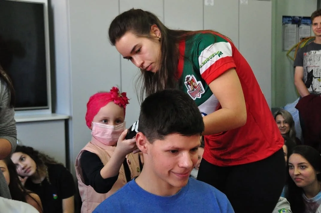 Os calouros tiveram seus cabelos raspados por crianças em tratamento oncológico no Hospital São Vicente de Paulo