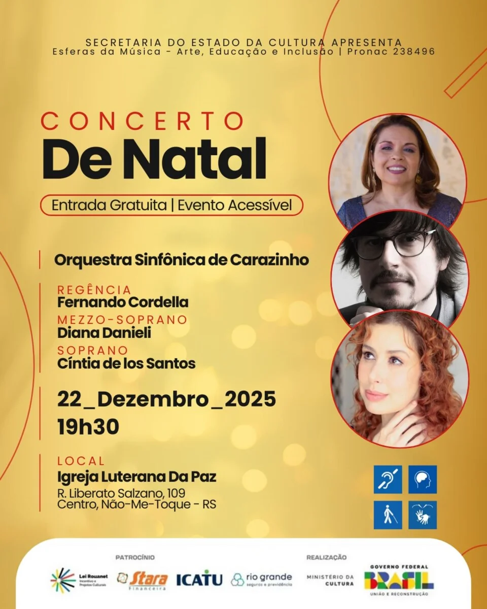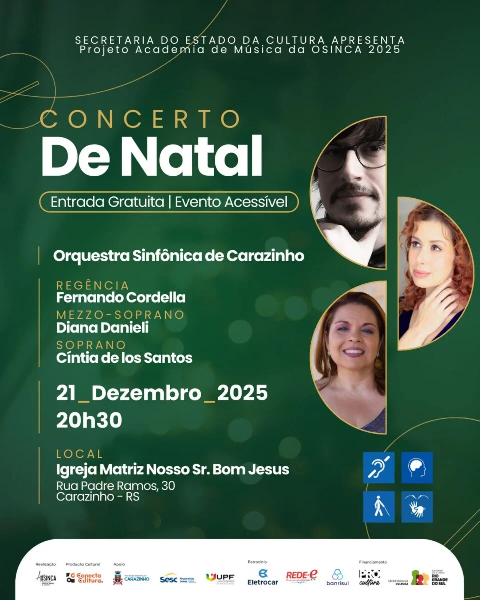 Já em Carazinho, a magia do Natal será celebrada no dia 21 de dezembro de 2025, às 20h30, na Igreja Matriz Nosso Senhor Bom Jesus. O Concerto de Natal contará com a participação de vozes convidadas e um repertório emocionante, reforçando o caráter simbólico e afetivo desta época do ano.