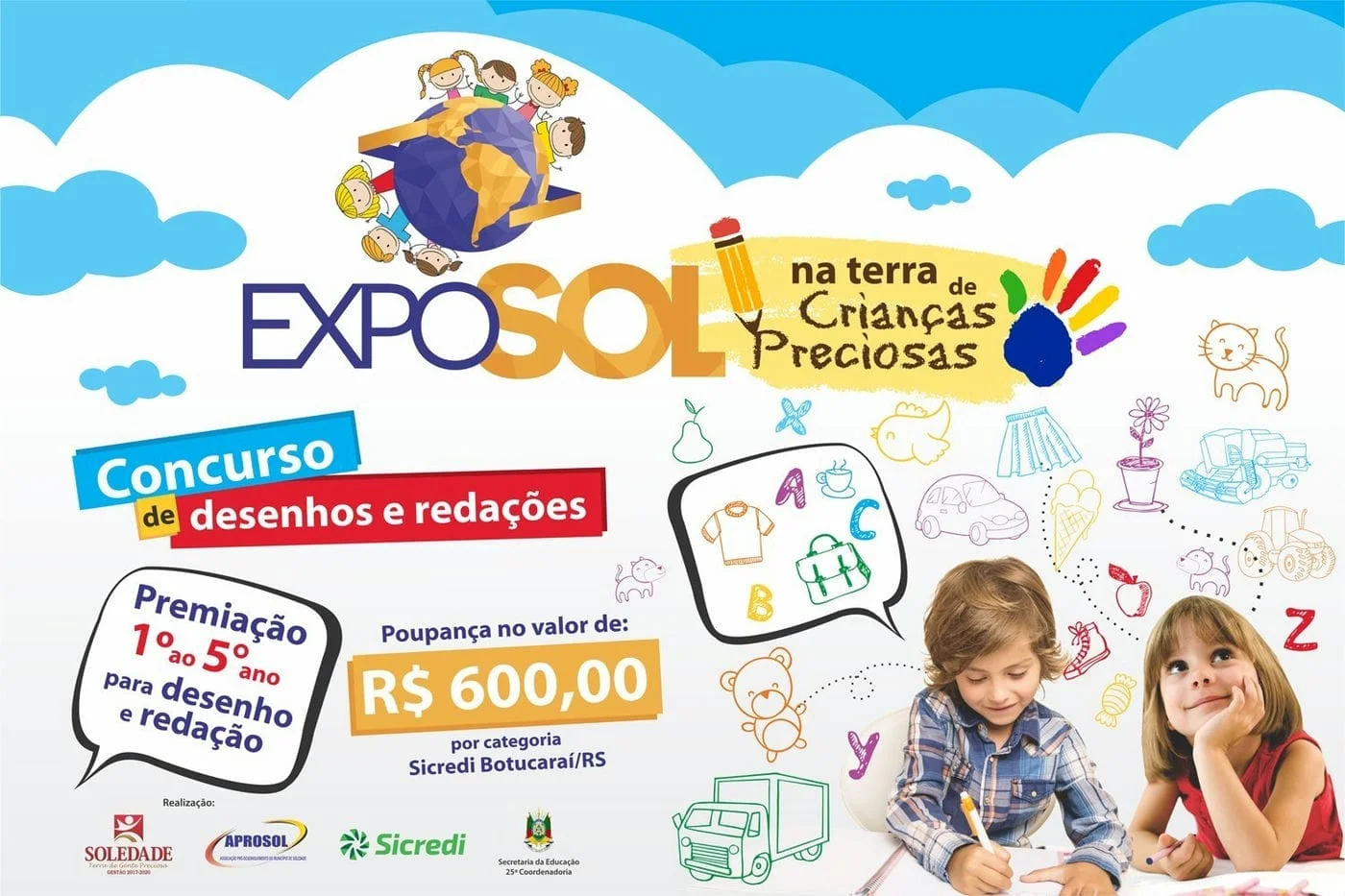 Envolver os alunos do sistema municipal, estadual e privado de Soledade com a maior Feira de joias e pedras preciosas da América Latina e maior multissetorial do interior do Estado. Este é o propósito do projeto “Exposol na Terra de Crianças Preciosas”, que vai premiar cinco estudantes com uma poupança no Sicredi, no valor de R$ 600,00 cada.