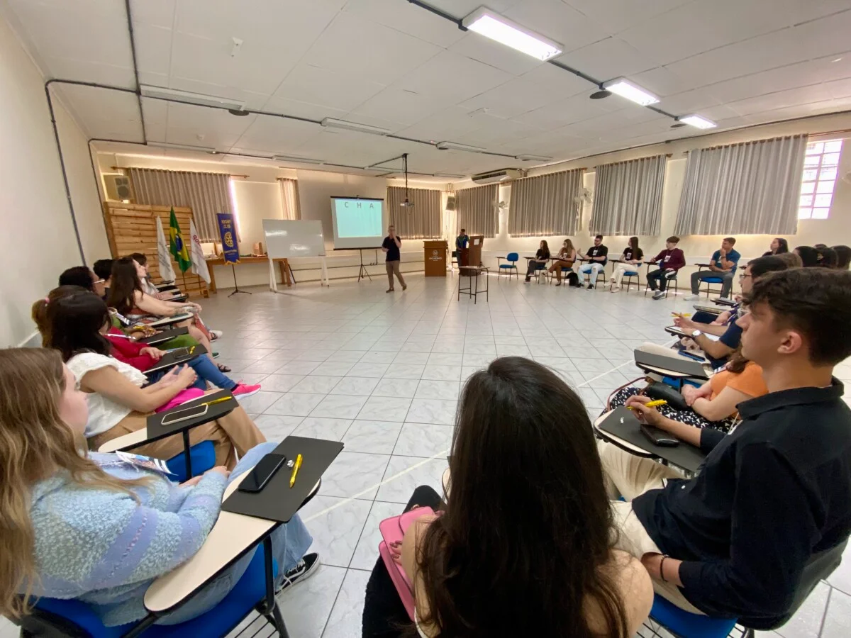 A programação incluiu apresentações sobre Rotary e Rotaract, competências da liderança, oratória, comunicação e desinibição, aplicadas com desafios em grupos, jogos empresariais e vivências práticas, além de coffee break disponibilizado aos participantes.