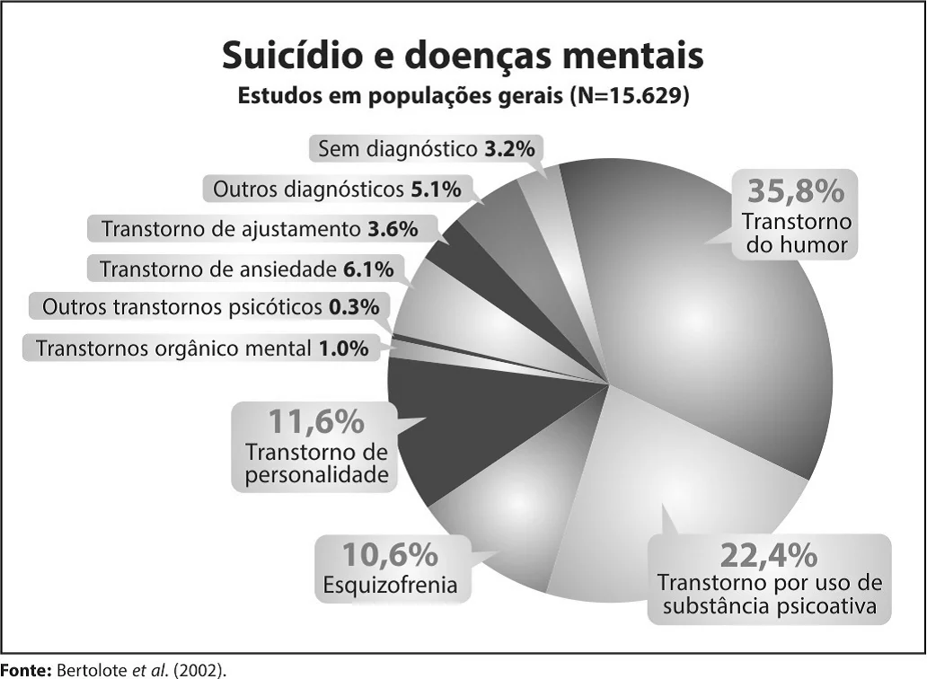 Para prevenir novos casos de suicídio o reconhecimento dos fatores de risco e dos fatores protetores é fundamental. Os dois principais fatores de risco são: tentativa de suicídio anterior e doença mental, como aponta o gráfico: