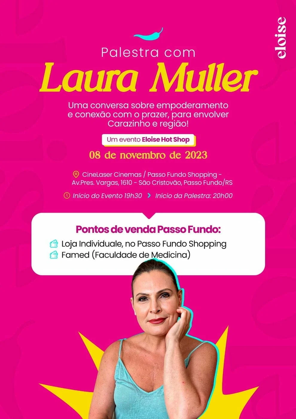 No dia 08 de Novembro, quarta-feira, a renomada sexóloga, Laura Muller, vai estar na cidade de Passo Fundo, a convite da loja de bem-estar íntimo, Eloise Hot Shop, para uma noite inesquecível de conversas abertas inspiradoras. O evento promete ser uma experiência transformadora, para elevar o conhecimento sobre saúde, bem-estar e autoconhecimento.
