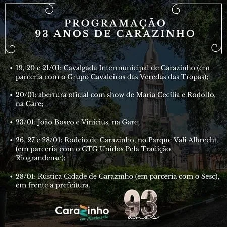Confira a programação completa dos 93 anos de Carazinho: