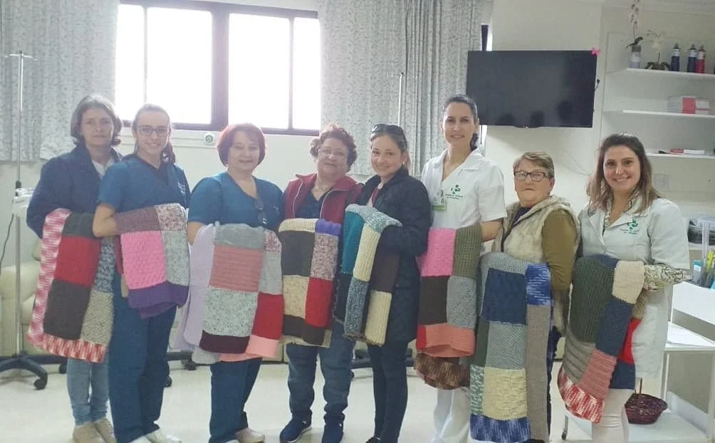 Criado pelas enfermeiras do setor de Oncologia, a atividade, que começou apenas como um passatempo, hoje é um meio de espalhar solidariedade pelo HCC. A enfermeira Janete Ferla conta que, com apenas um ano de existência, a iniciativa já trouxe bons resultados para todos. “Enquanto aguardam, os acompanhantes dos pacientes confeccionam os quadradinhos de tricô e crochê, que, depois de prontos, são unidos e transformados em cobertores – que são doados para as pessoas que necessitam. Nós já temos cerca de 20 mantinhas prontas. É uma forma de entretenimento e de estímulo à solidariedade”, destaca.