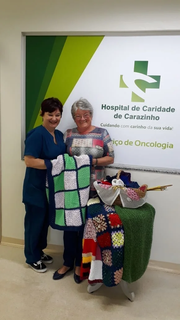 Acompanhante do marido em suas sessões de quimioterapia, a aposentada Leda Melo foi uma das primeiras a abraçar o projeto. “Eu sempre ficava fazendo tricô e crochê na sala de espera e foi então que a Janete veio falar comigo sobre a ideia. Eu, é claro, a apoiei. Ajudei com as agulhas, o cesto, conseguimos algumas lãs com amigos e familiares, linhas, e então a iniciativa começou. Hoje, juntamente com um grupo de amigas, nós fechamos os quadradinhos, finalizamos o trabalho e entregamos para que elas sejam doadas para aquelas pessoas que necessitam. Já foram confeccionados diversas mantinhas, além de um poncho que finalizamos recentemente”, comenta.