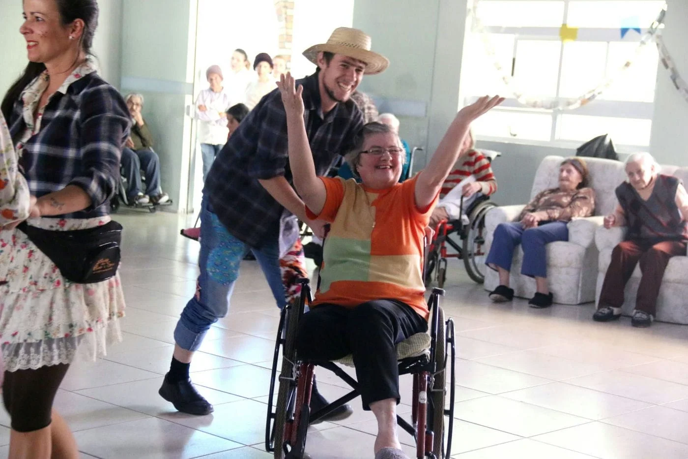 Os voluntários tiraram todos os vôzinhos e vózinhas para dançar. Nem aqueles que estavam em cadeiras de roda escaparam da dança! Eles se divertiram usando as perucas do grupo e aprovaram o lanche servido.