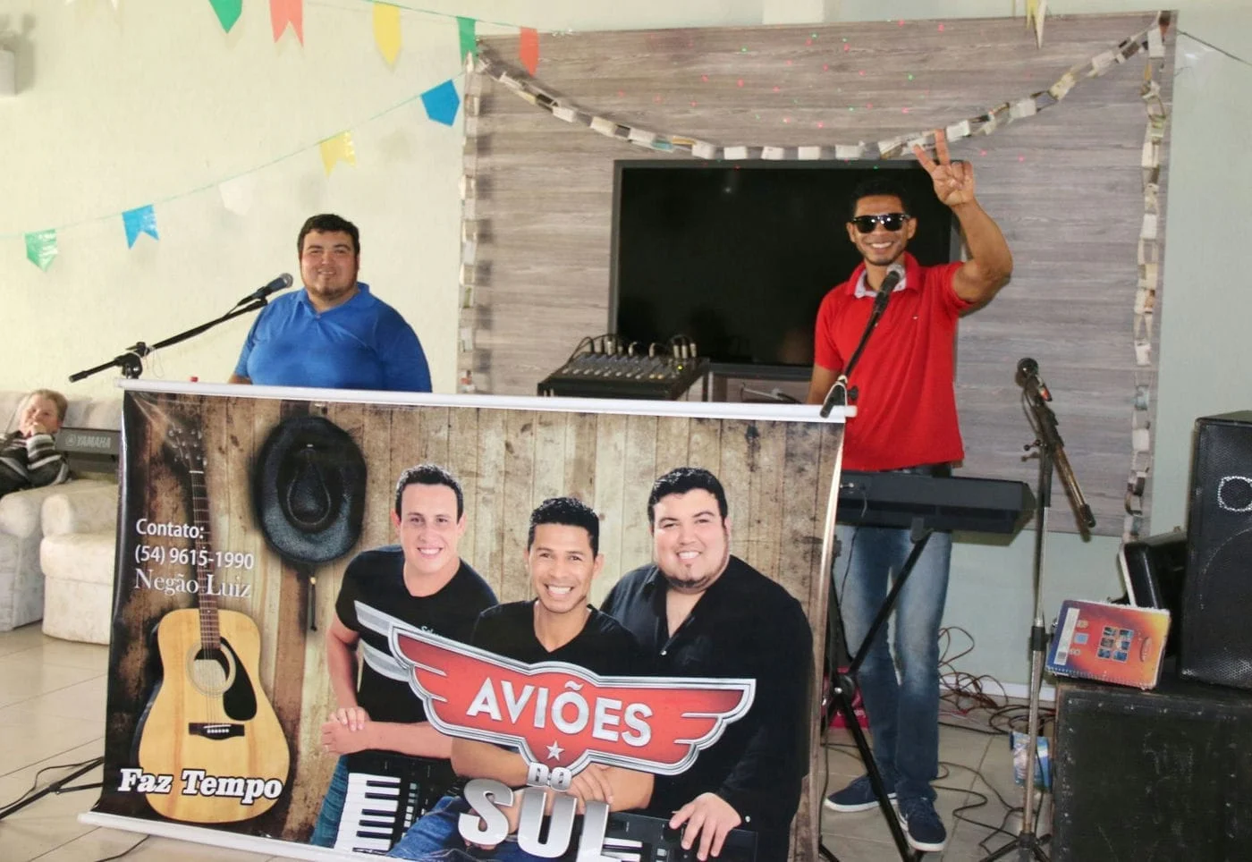 No último domingo, dia 3 de julho, o Recanto São Vicente de Paulo de Carazinho foi tomado por muita alegria no primeiro Arraial Solidário promovido pelo grupo Voluntários do Riso. A ideia inicial do grupo era apenas levar alguns lanches diferentes e cantar algumas canções juninas, mas a solidariedade foi tanta que a ação acabou virando uma grande festa! A comunidade e alguns estabelecimentos comerciais ajudaram com as comidas típicas de São João, guardanapos, copos e pratinhos. Teve bolos, cachorro quente, carrapinha e até canjica! O grupo Aviões do Sul surpreendeu os voluntários ao aparecer por lá com caixas de som e todos os seus instrumentos para fazer uma festa completa aos idosos, que durou a tarde toda com música ao vivo.