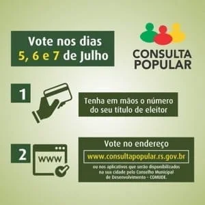 A votação da Consulta Popular 2016/2017 acontecerá nos dias 5, 6 e 7 de julho. Estão habilitados a votar nos Programas apenas os eleitores com domicílio eleitoral na região do Corede Produção. Os eleitores poderão votar em apenas um dos Programas ou Ações constantes da cédula de votação. É necessário o número do título de eleitor.